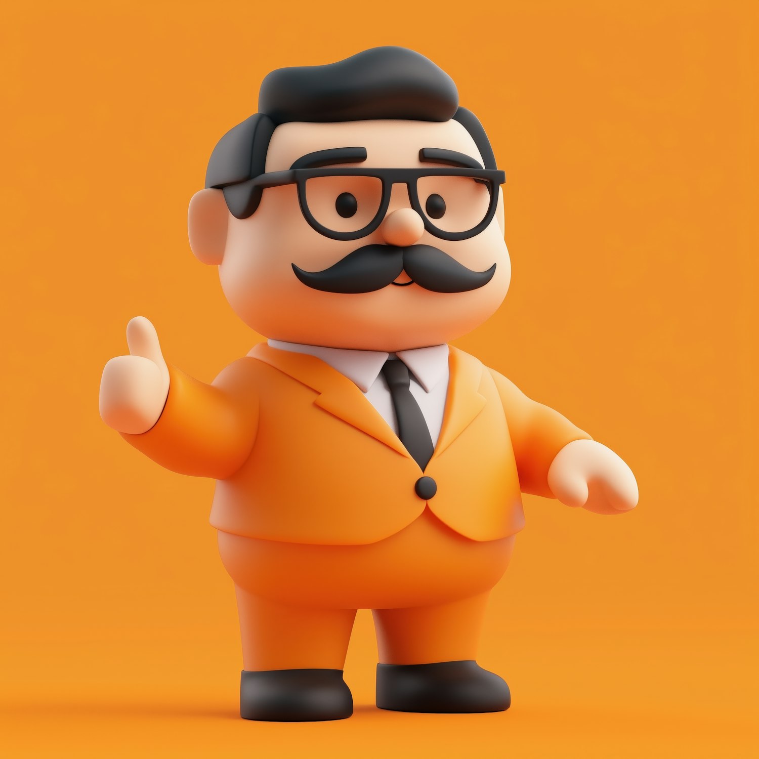 Cheerful 3D cartoon character in an orange suit giving a thumbs-up against a bright orange background. Fun and vibrant design!