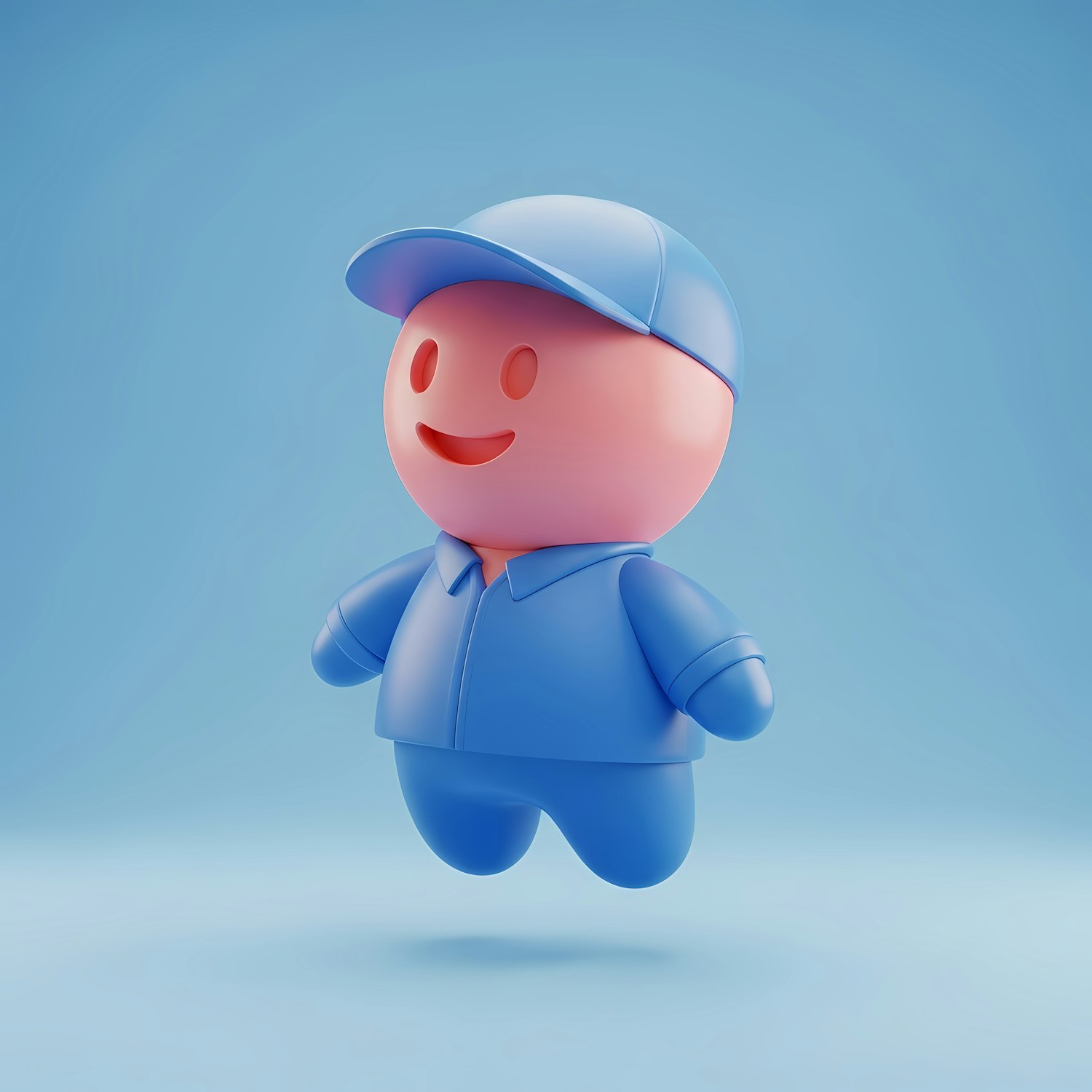 Adorable 3D cartoon character in blue outfit and cap, smiling cheerfully against a light blue background. Perfect for fun designs.