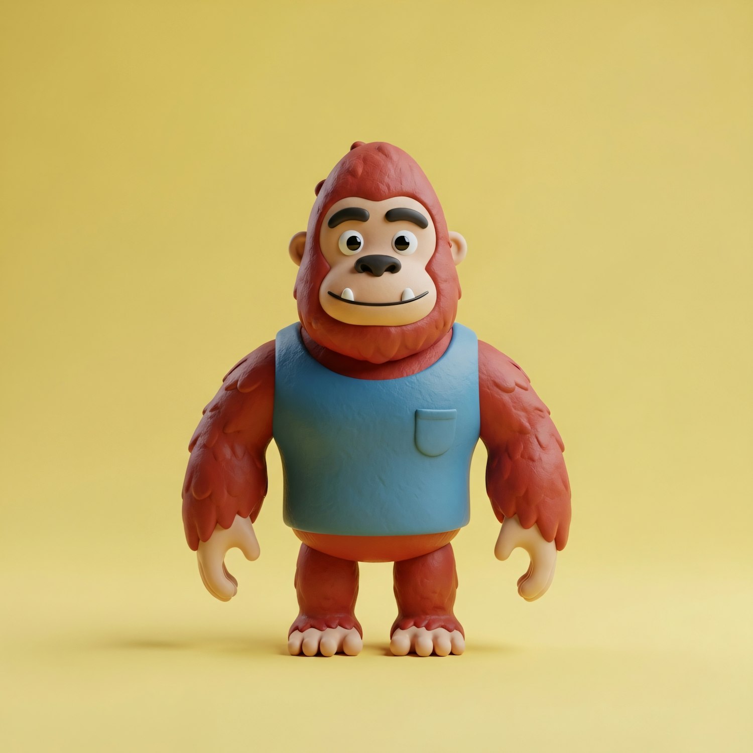 A cheerful cartoon gorilla with reddish-brown fur and a blue shirt stands against a yellow background, exuding a playful vibe.