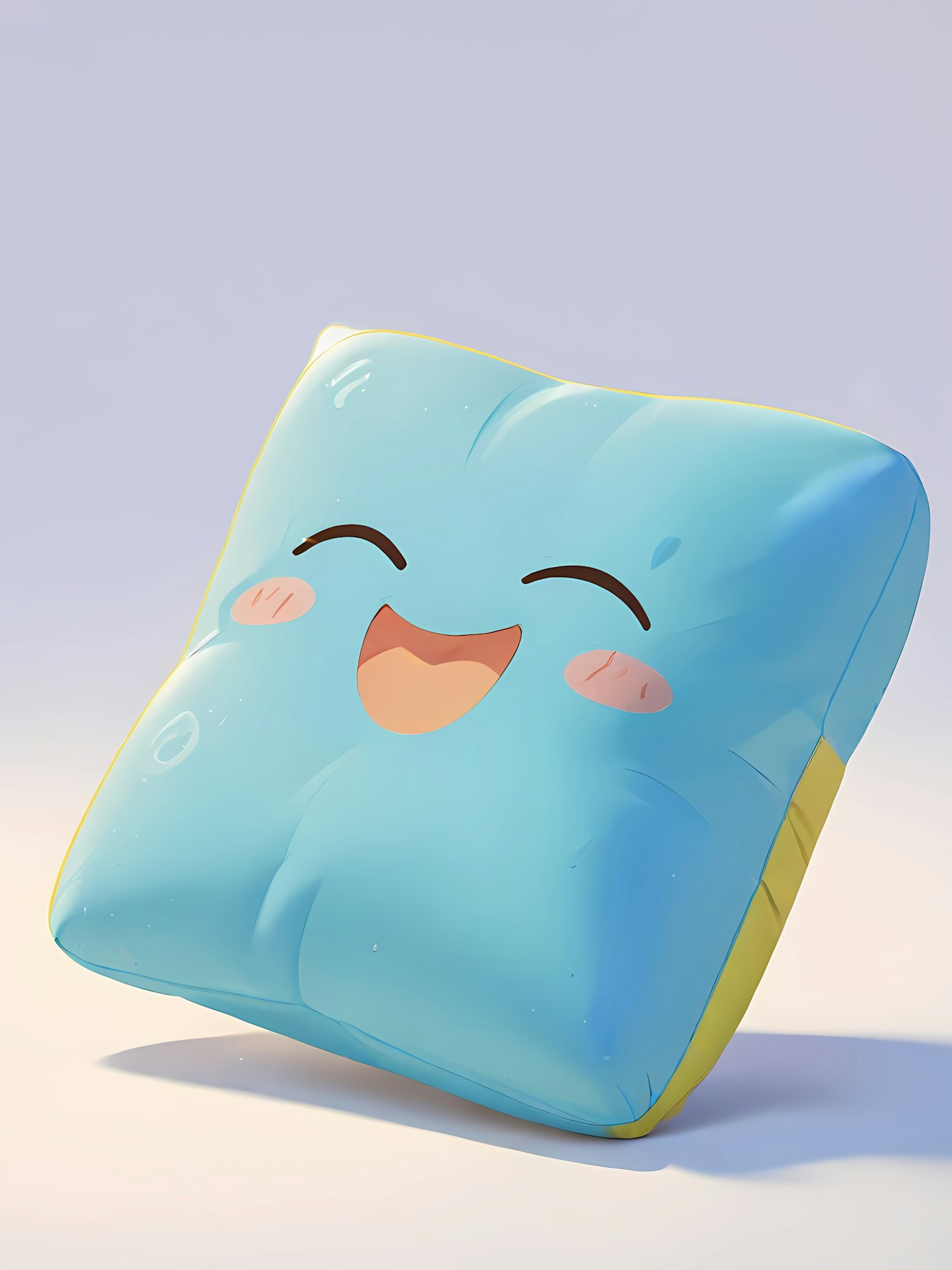 Adorable cartoon pillow with a glossy blue surface, yellow underside, and a cheerful face featuring a big smile and pink blush marks.