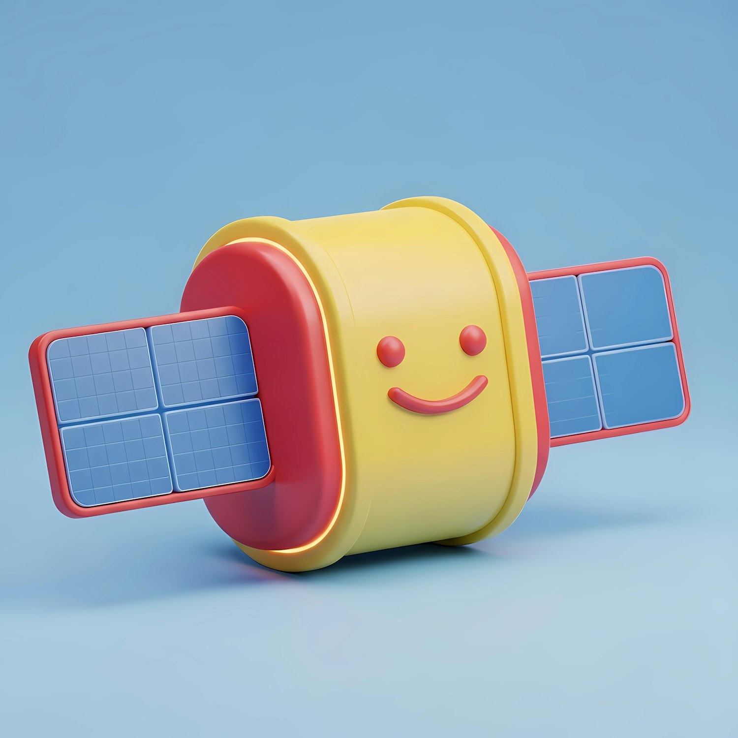 A cute 3D cartoon satellite with a smiling face, yellow body, and blue solar panels, set against a light blue background.