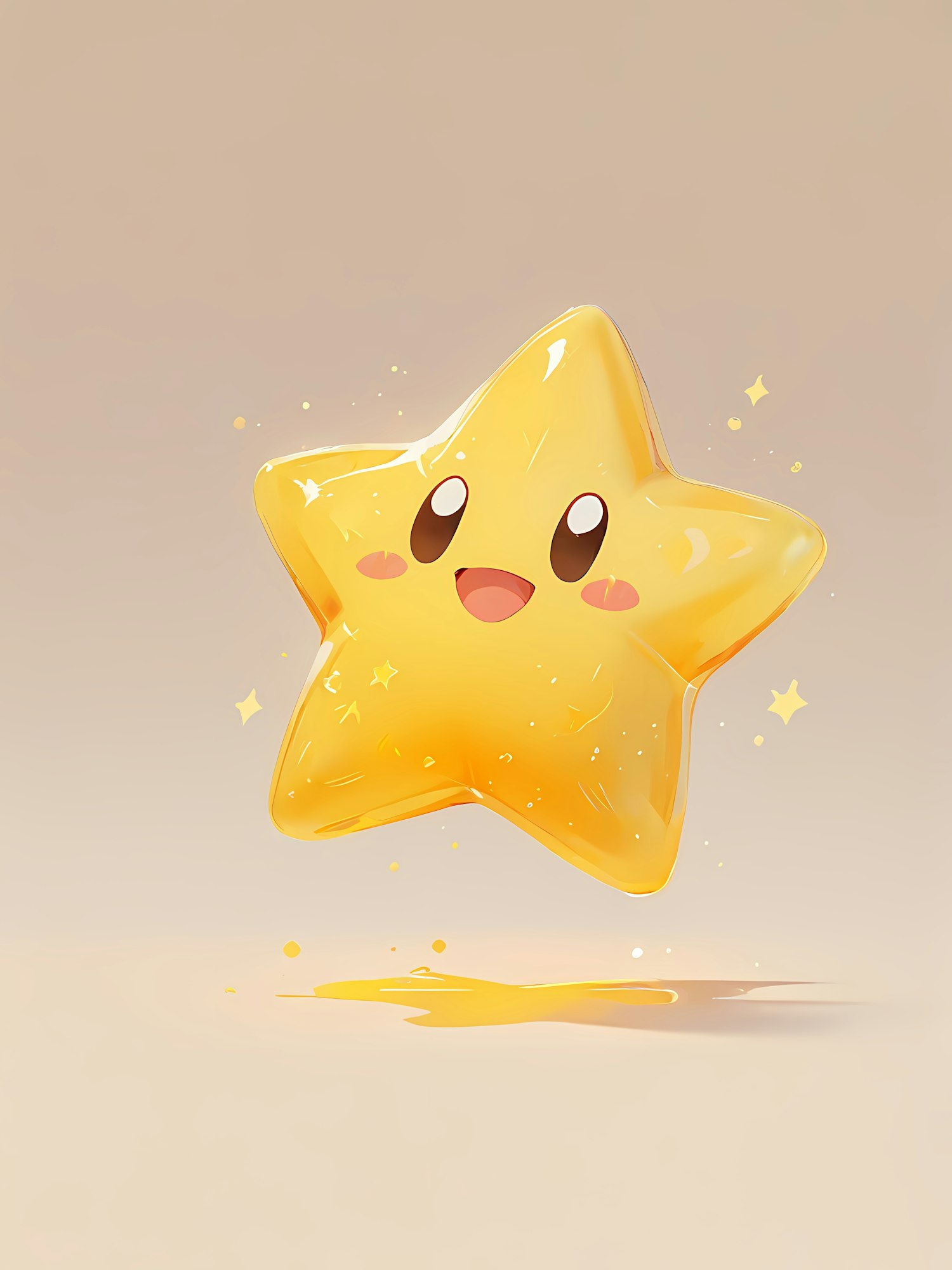 A cute, glossy yellow star with a smiling face floats surrounded by sparkles on a soft beige background. Perfect for a whimsical vibe.