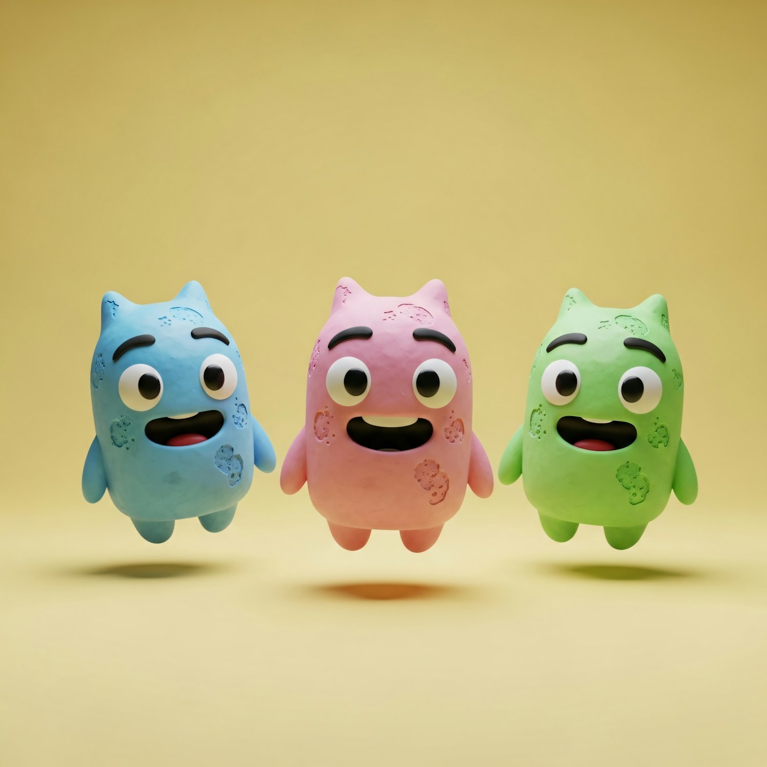 Three colorful cartoon characters with expressive faces and playful designs float against a soft yellow background.