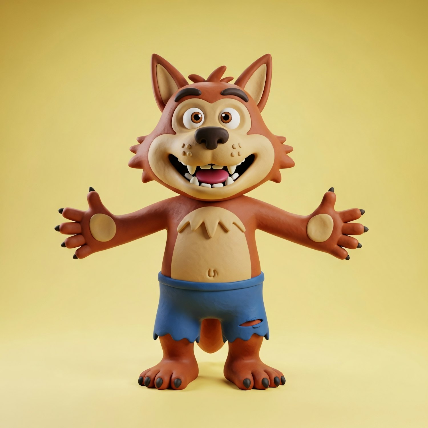 A cheerful cartoon wolf character with open arms, light brown fur, and tattered blue shorts on a yellow background.