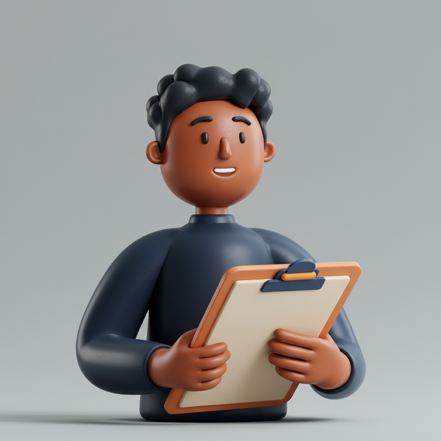 3D illustration of a cheerful character holding a clipboard, perfect for concepts like organization, planning, or teamwork.