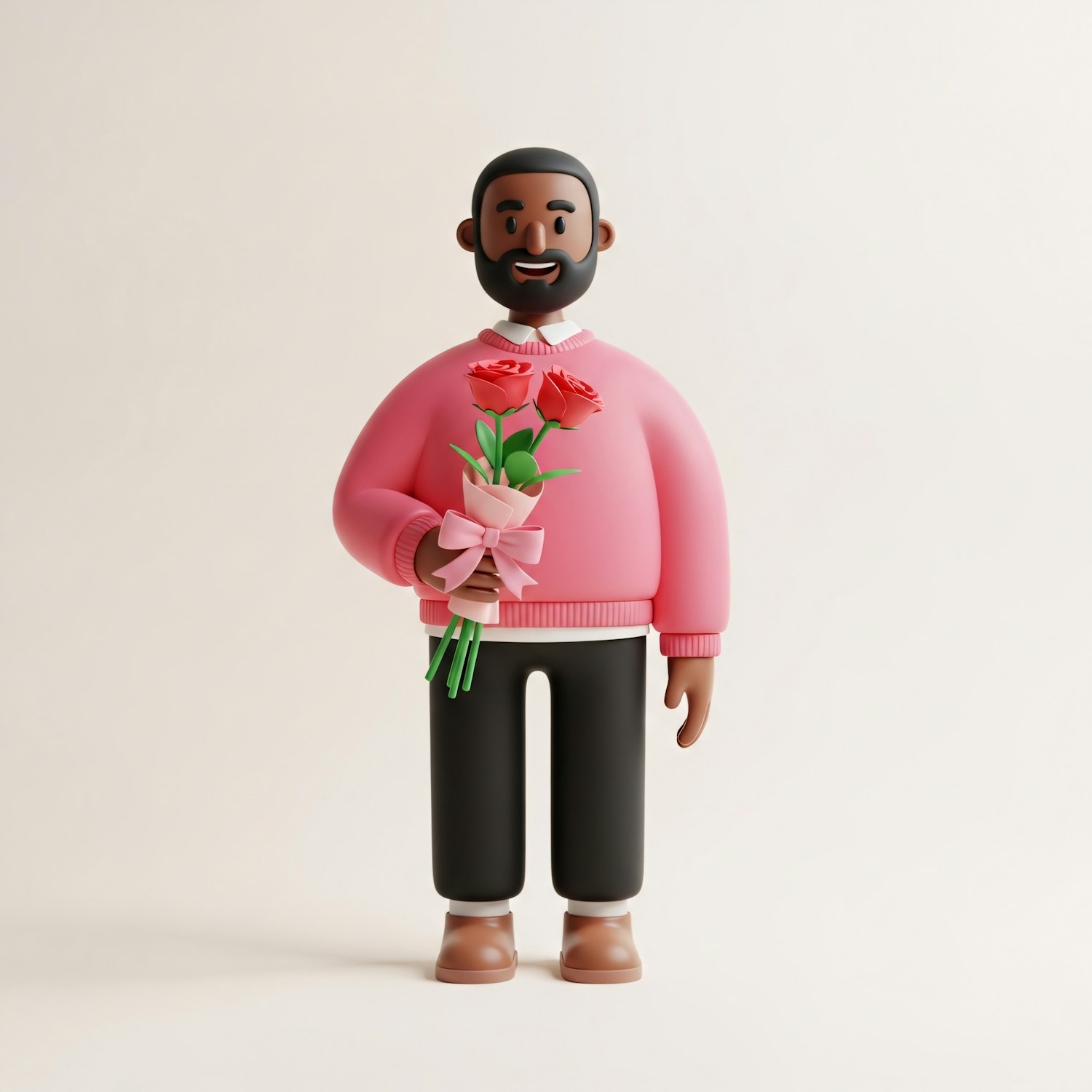 A cheerful 3D character holding a bouquet of red roses, dressed in a pink sweater and black pants, set against a light beige background.
