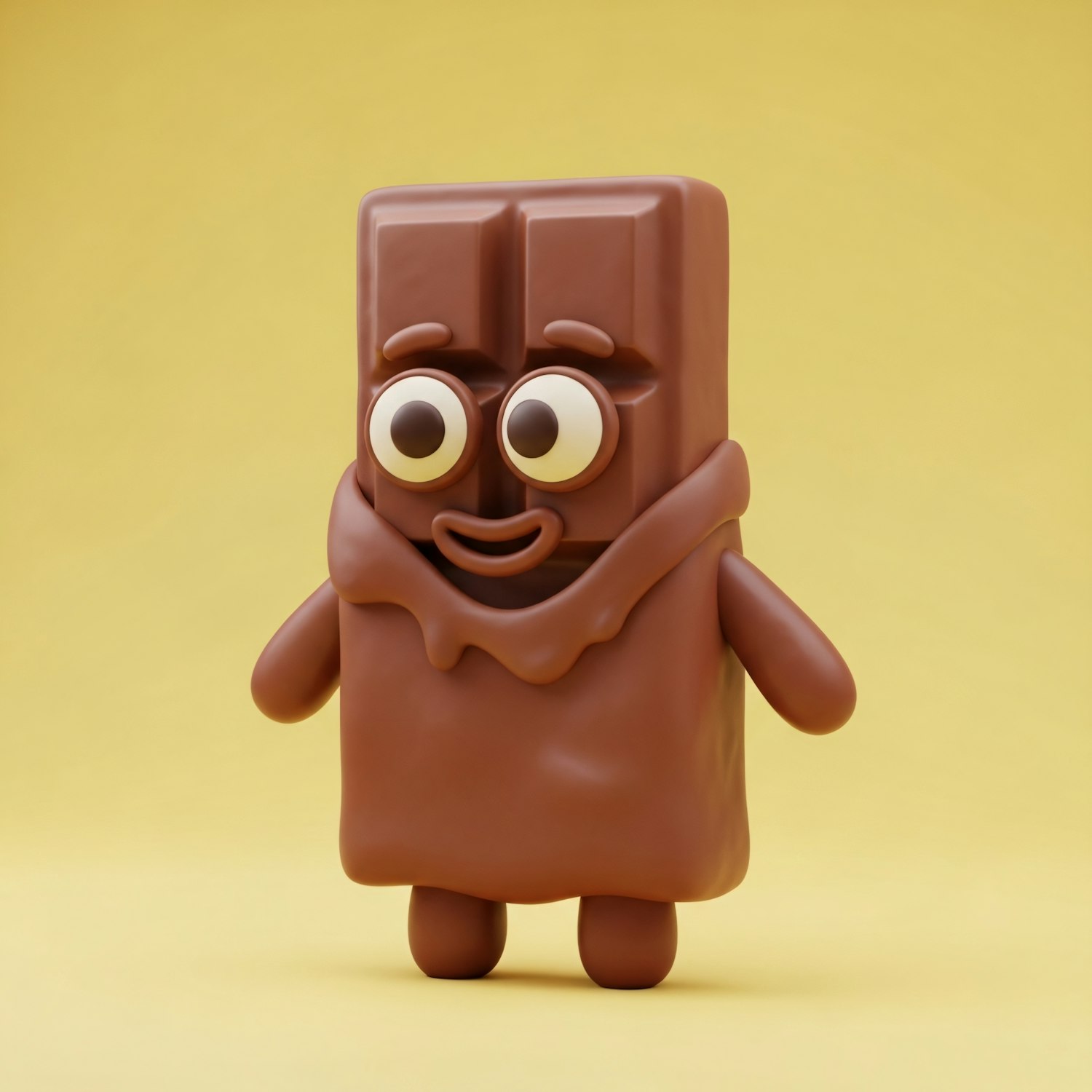 A cute 3D chocolate bar character with big eyes and a smile, set against a warm yellow background, perfect for playful designs.