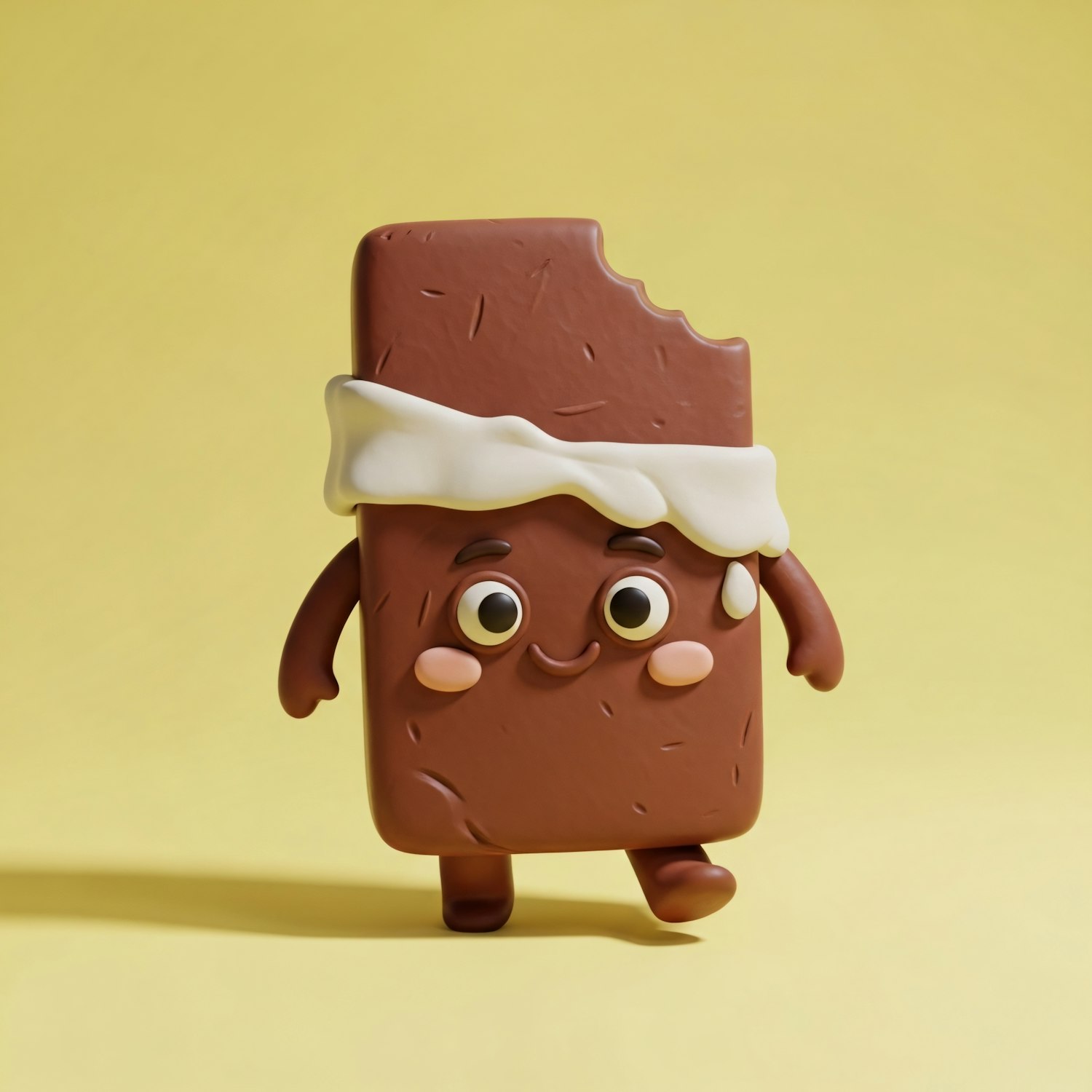 A cute 3D chocolate bar character with a bite missing, expressive eyes, and a playful smile, set against a cheerful yellow background.