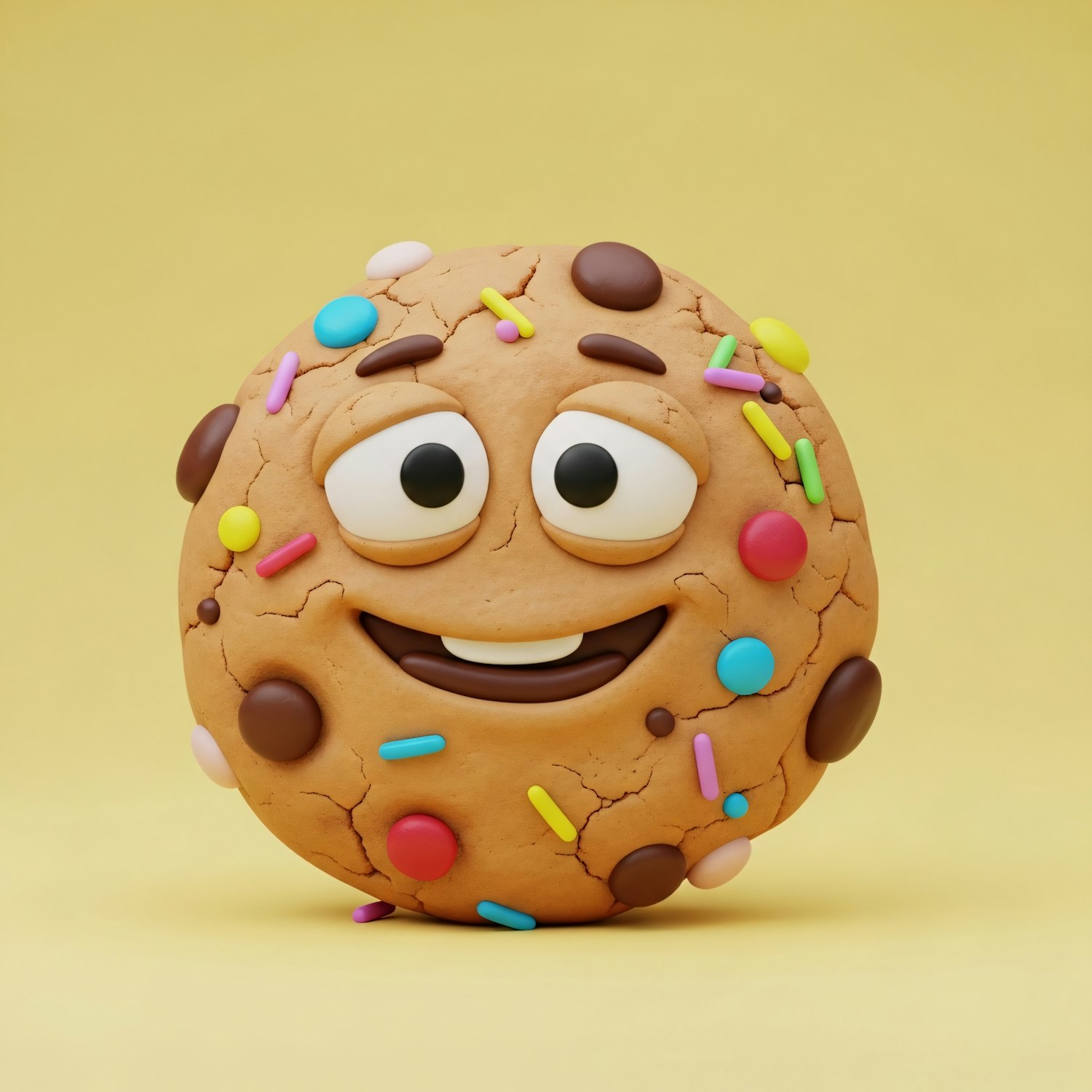 A cheerful cookie character with colorful sprinkles and chocolate chips on a bright yellow background, radiating fun and whimsy.