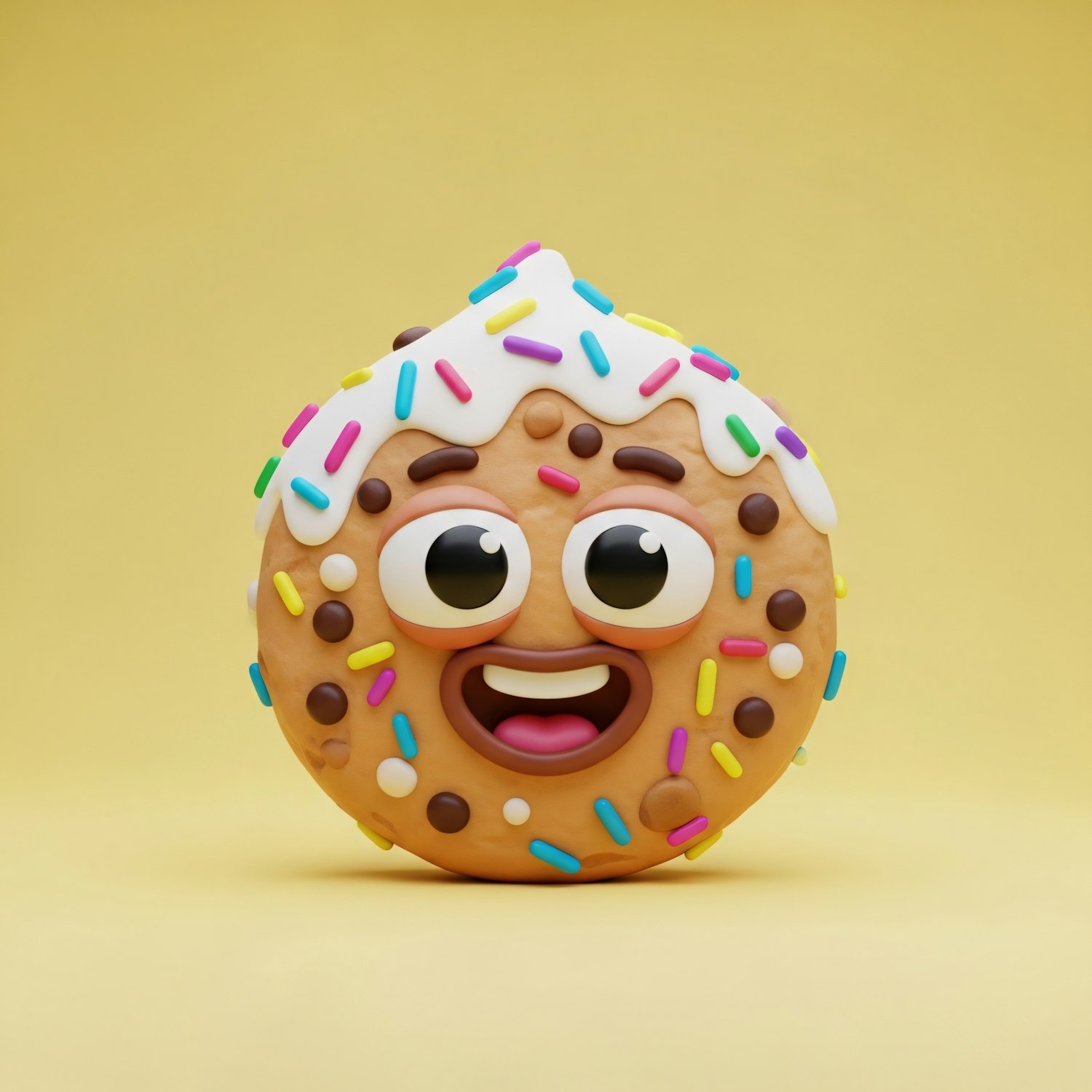A cheerful 3D cookie character with sprinkles and icing, set against a bright yellow background, radiating fun and whimsy.