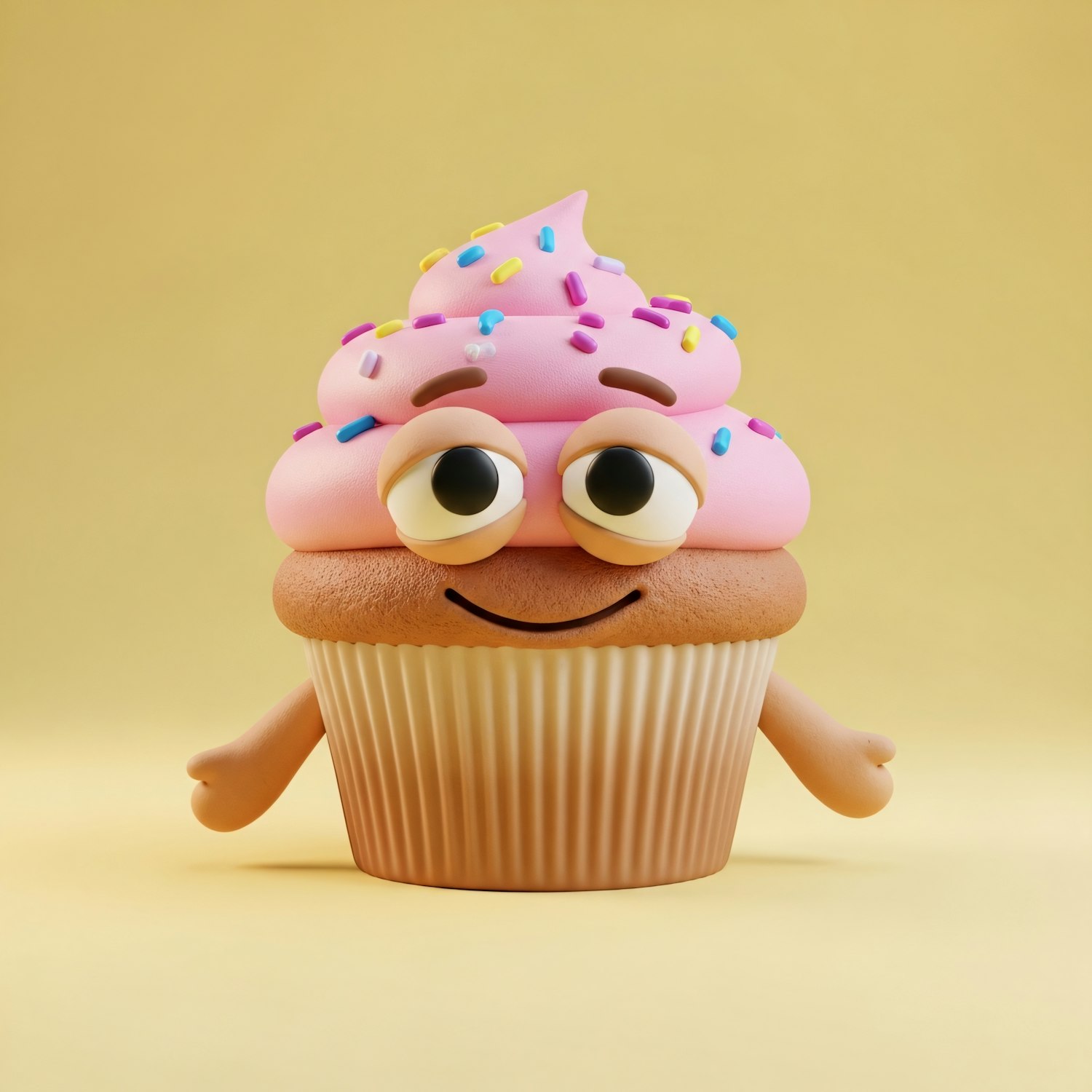 A cute cupcake character with pink frosting, sprinkles, and a cheerful face on a yellow background. Perfect for fun and playful designs.