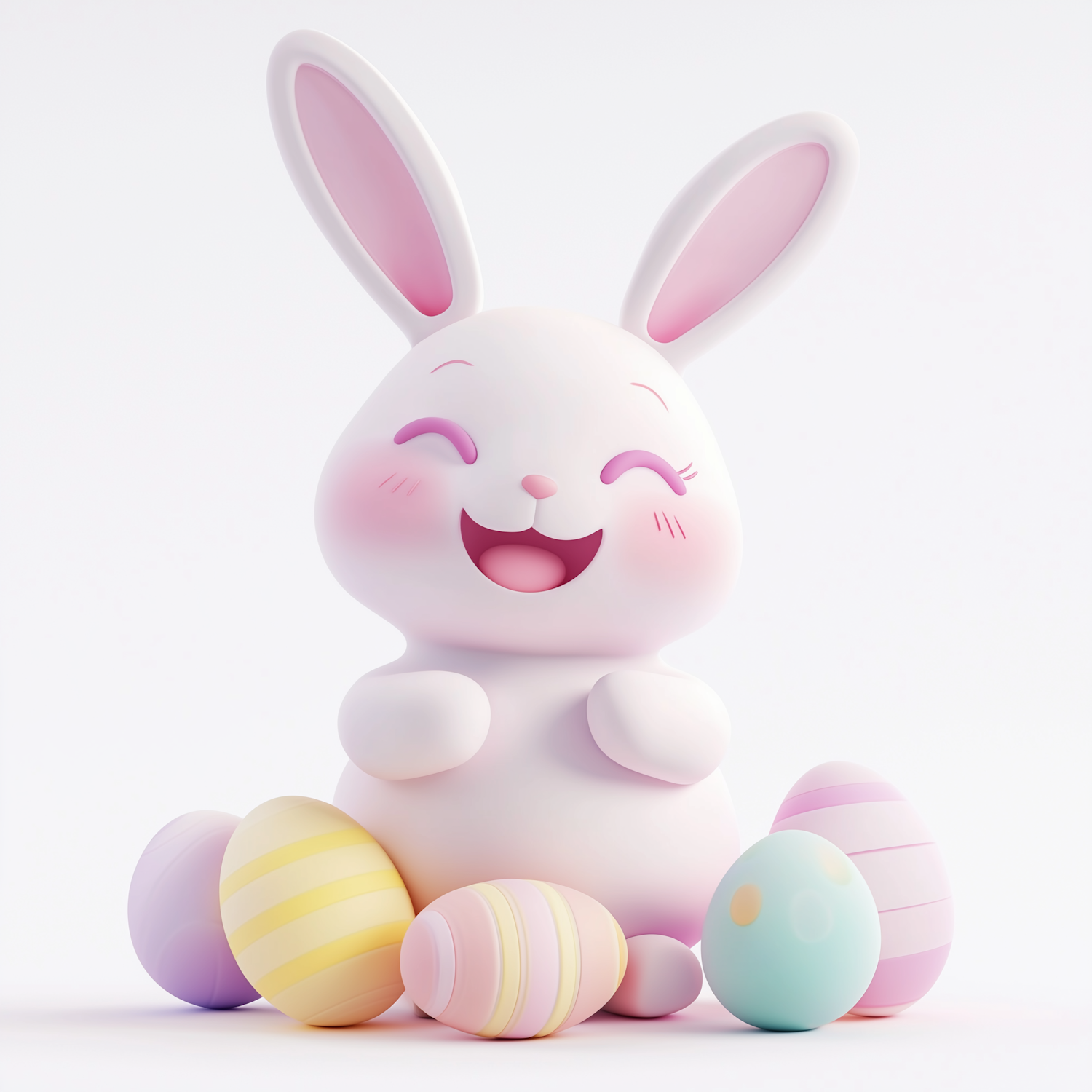 Adorable cartoon bunny with pastel Easter eggs, smiling joyfully in a clean white background. Perfect for festive and cheerful vibes!