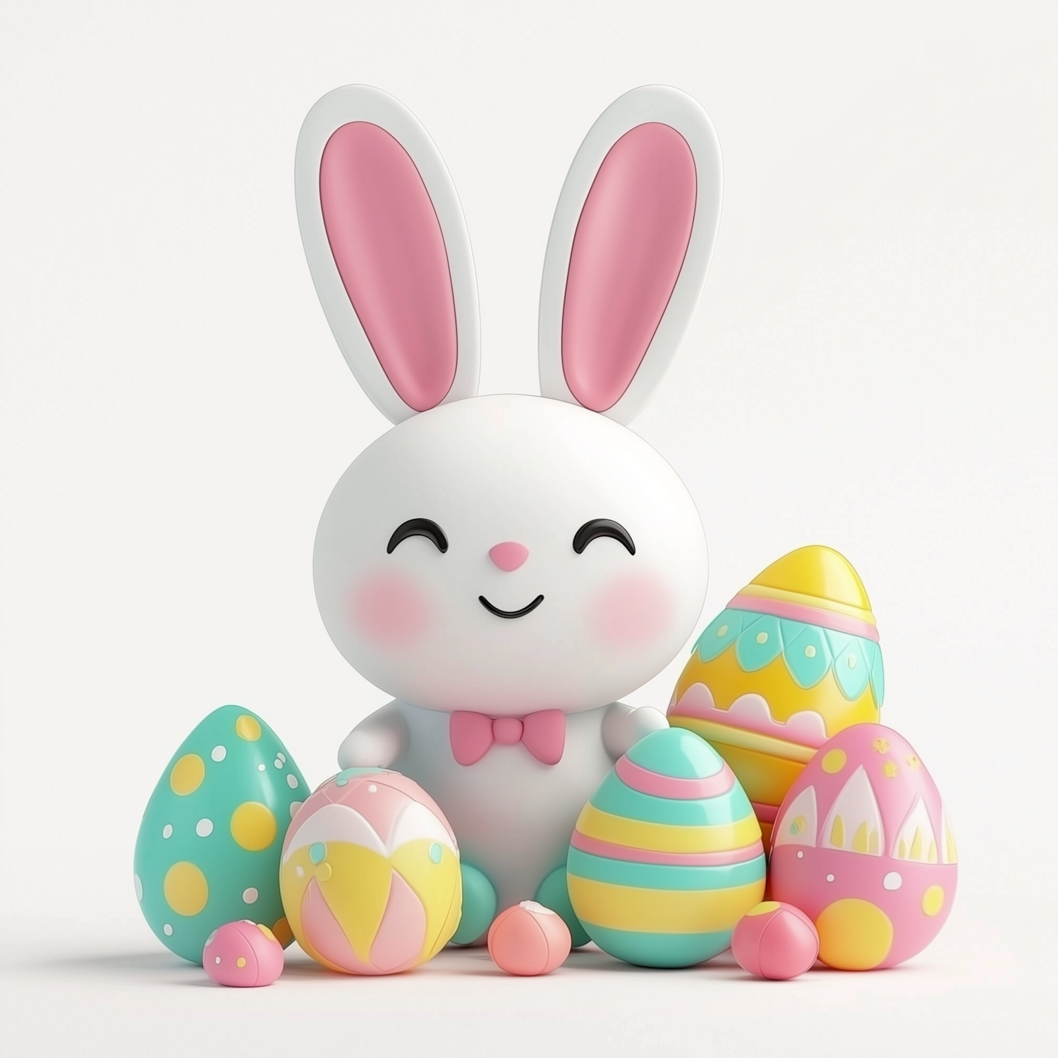 Adorable cartoon bunny with pastel Easter eggs in a festive, colorful design. Perfect for celebrating Easter and spring vibes!