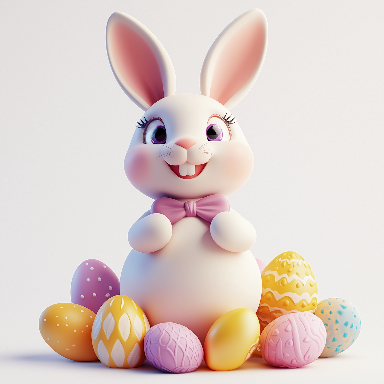 Adorable cartoon bunny with a pink bow tie surrounded by colorful Easter eggs in pastel shades. Perfect for Easter-themed designs!