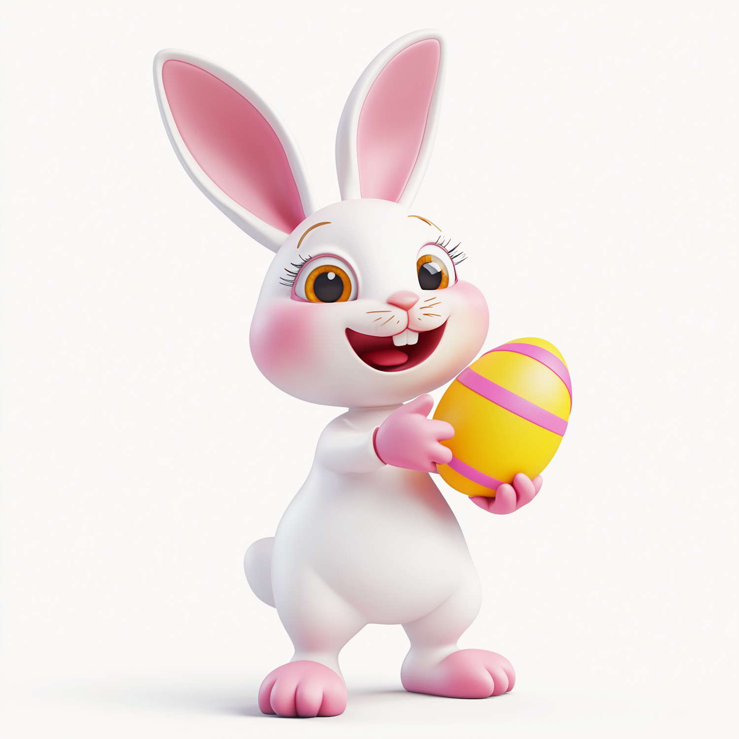 Adorable cartoon bunny holding a yellow Easter egg with pink stripes, radiating joy and festive vibes on a clean white background.
