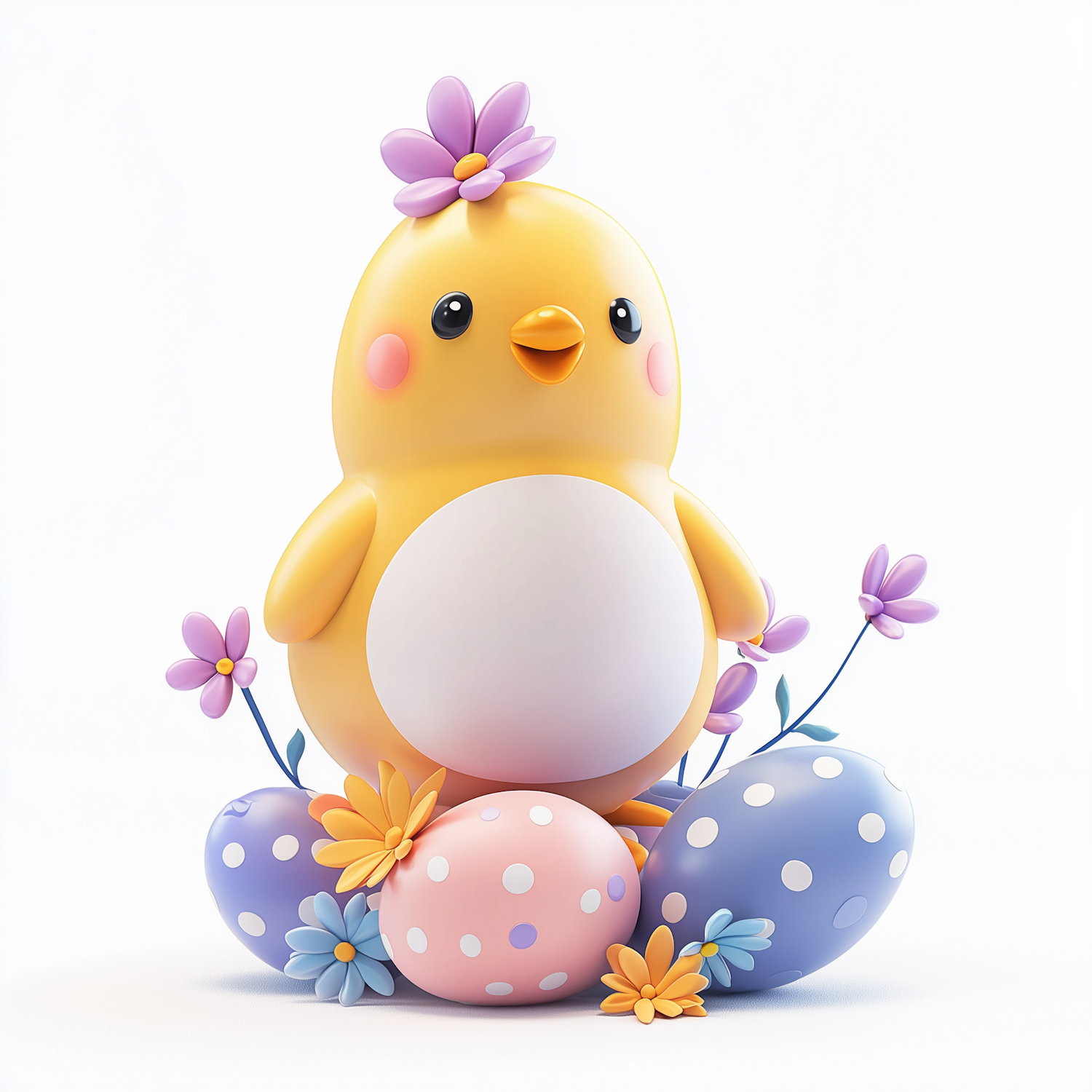 Adorable yellow cartoon chick with pastel Easter eggs and flowers, perfect for spring or Easter-themed designs.