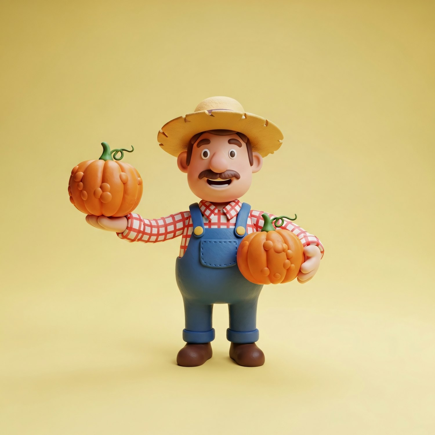 A cheerful cartoon farmer holding two pumpkins, dressed in overalls and a straw hat, set against a bright yellow background.