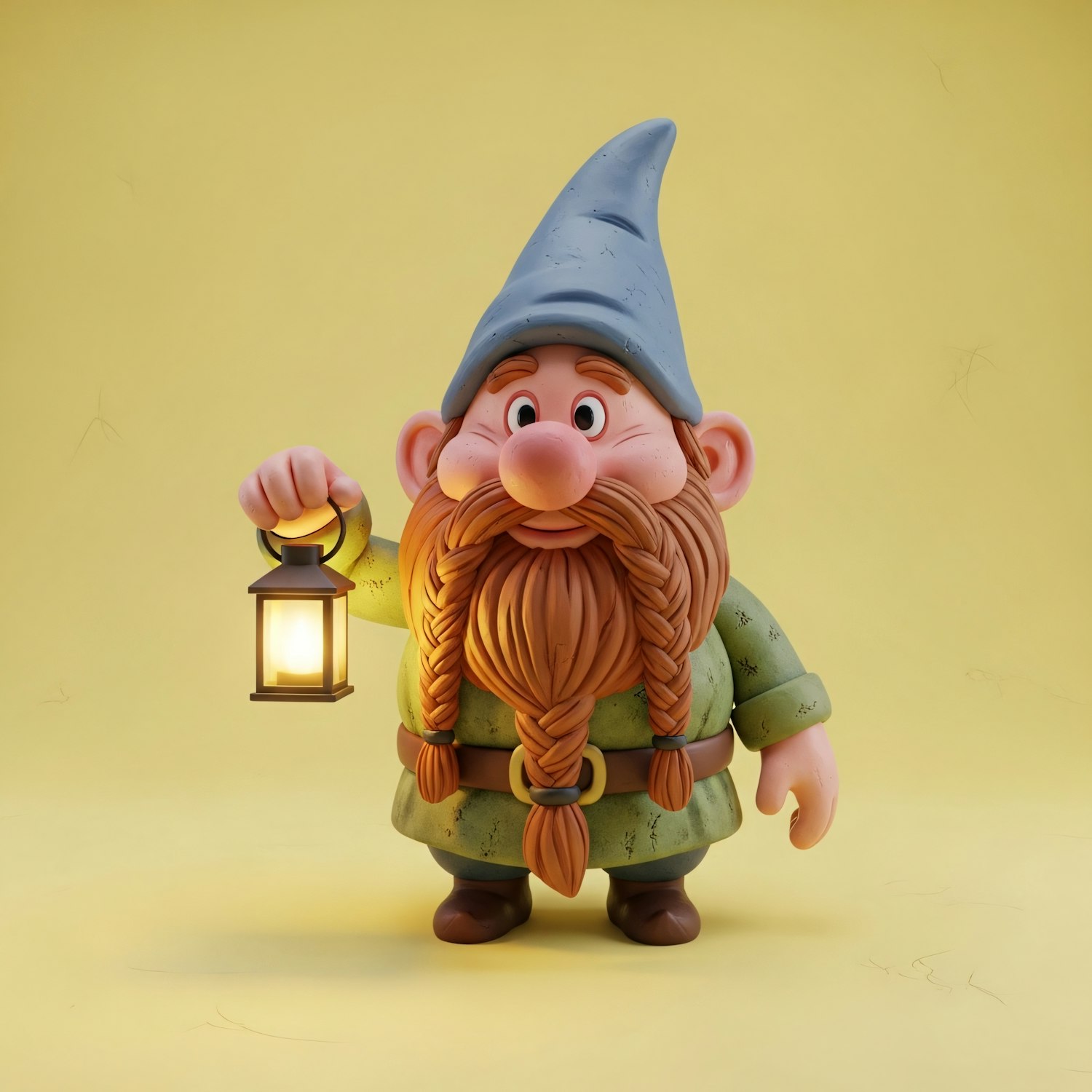 A charming 3D gnome with a braided beard and a glowing lantern, set against a yellow background, perfect for fantasy themes.