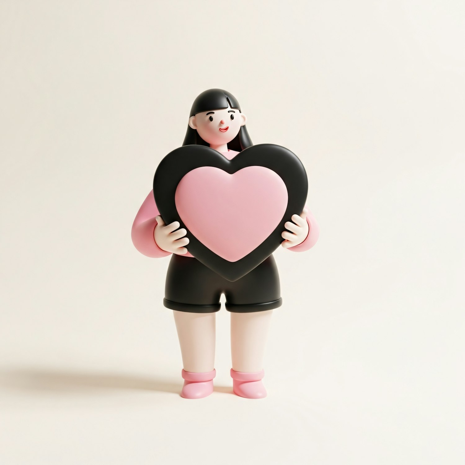 A cute 3D illustration of a character holding a pink and black heart, set against a light beige background.