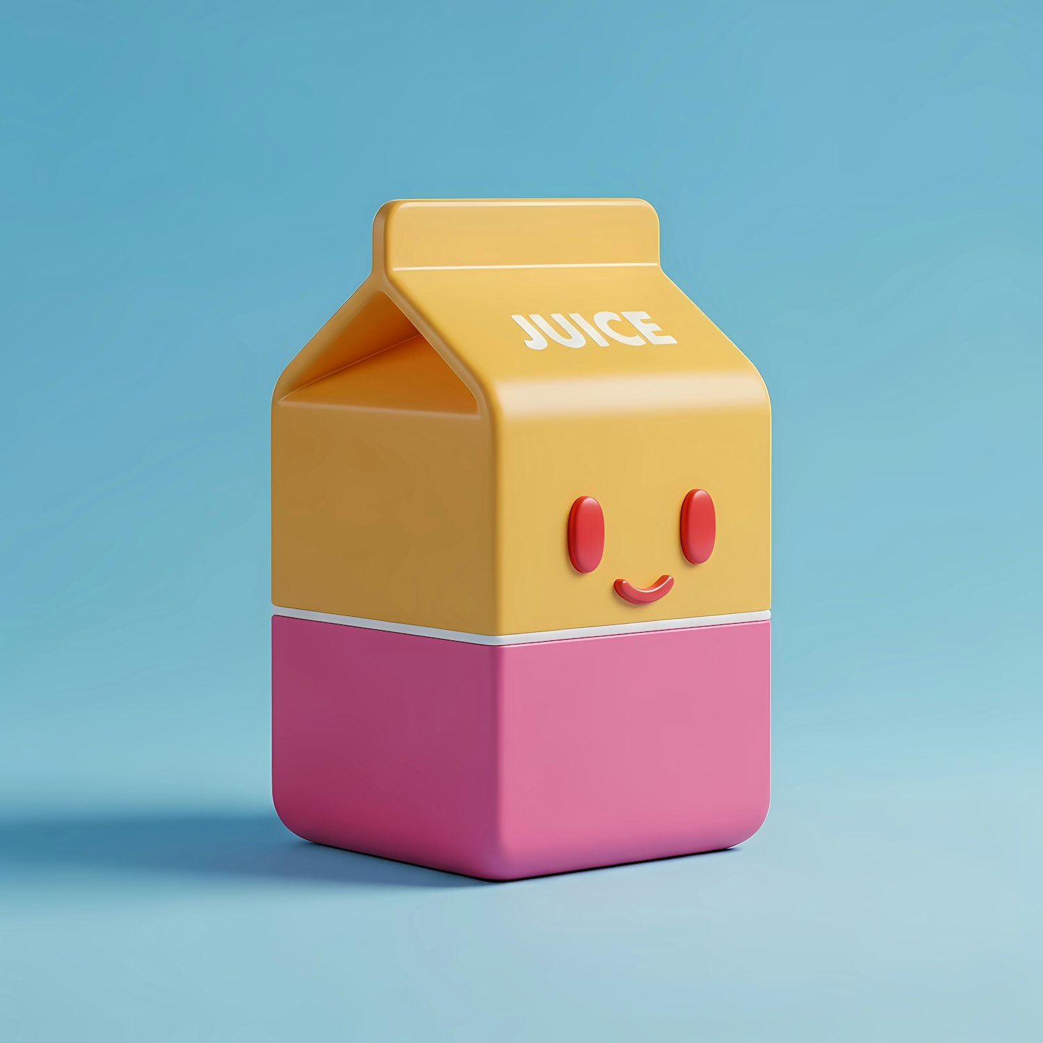 A cute 3D-rendered juice carton with a smiling face, yellow and pink design, and a light blue background. Perfect for playful designs.