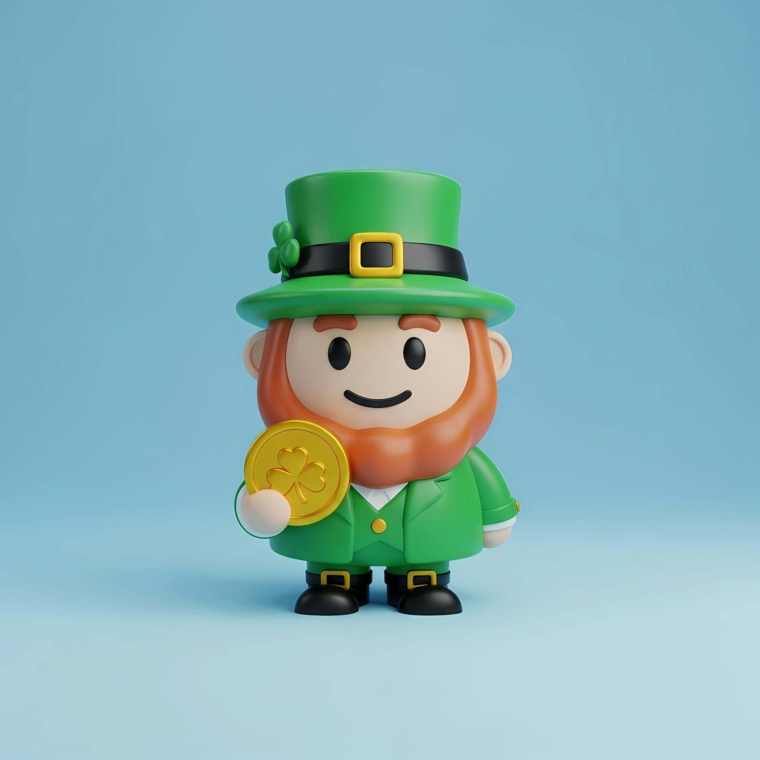 Adorable 3D leprechaun character in green attire holding a lucky gold coin, set against a light blue background.