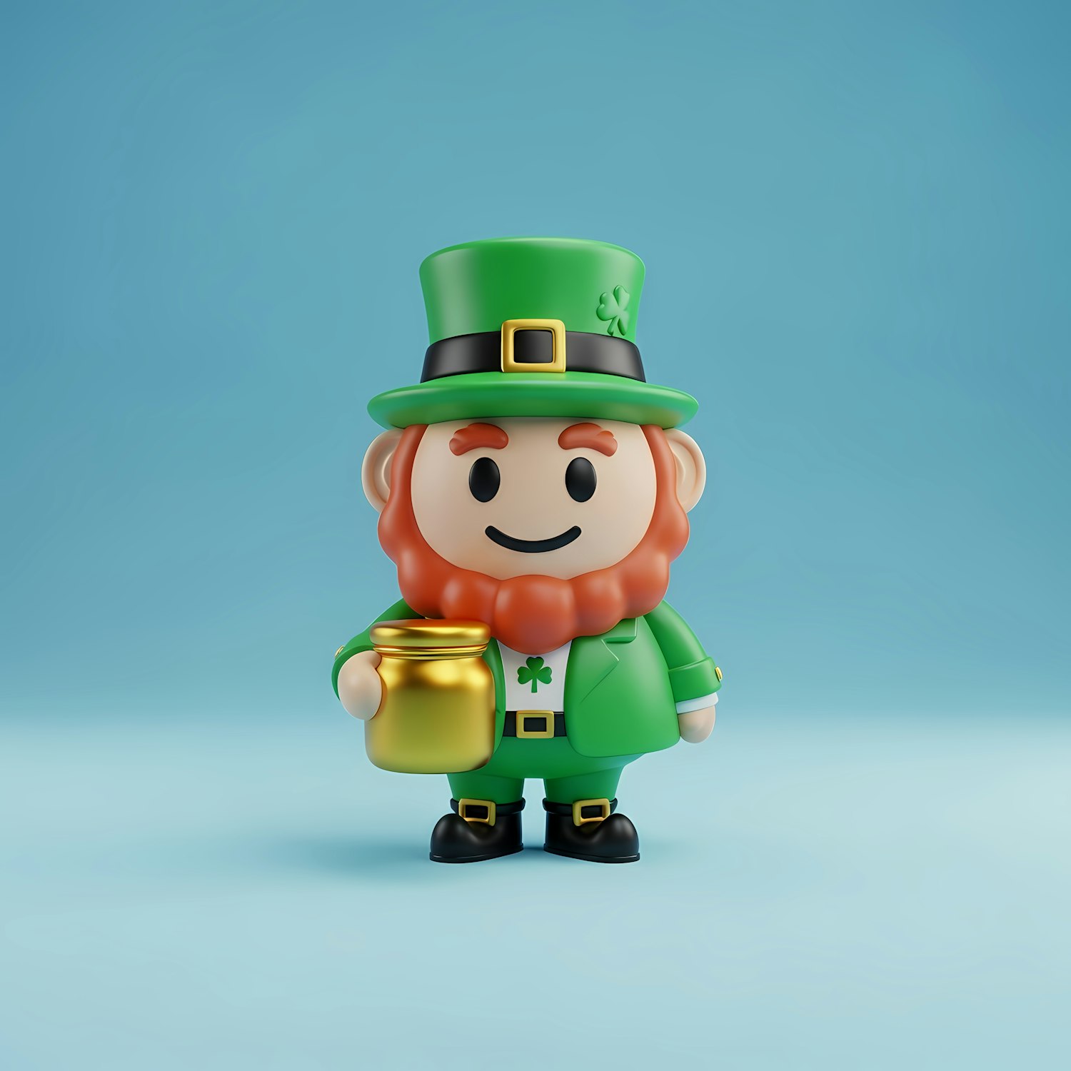 Cute cartoon leprechaun with a green suit and hat, holding a pot of gold, set against a light blue background. Perfect for St. Patrick's Day!