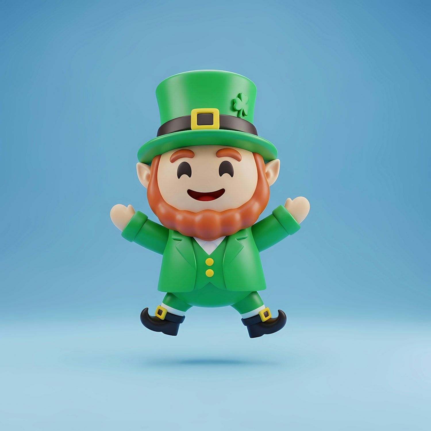 A vibrant 3D illustration of a cheerful leprechaun in a green outfit, jumping with joy against a light blue background.