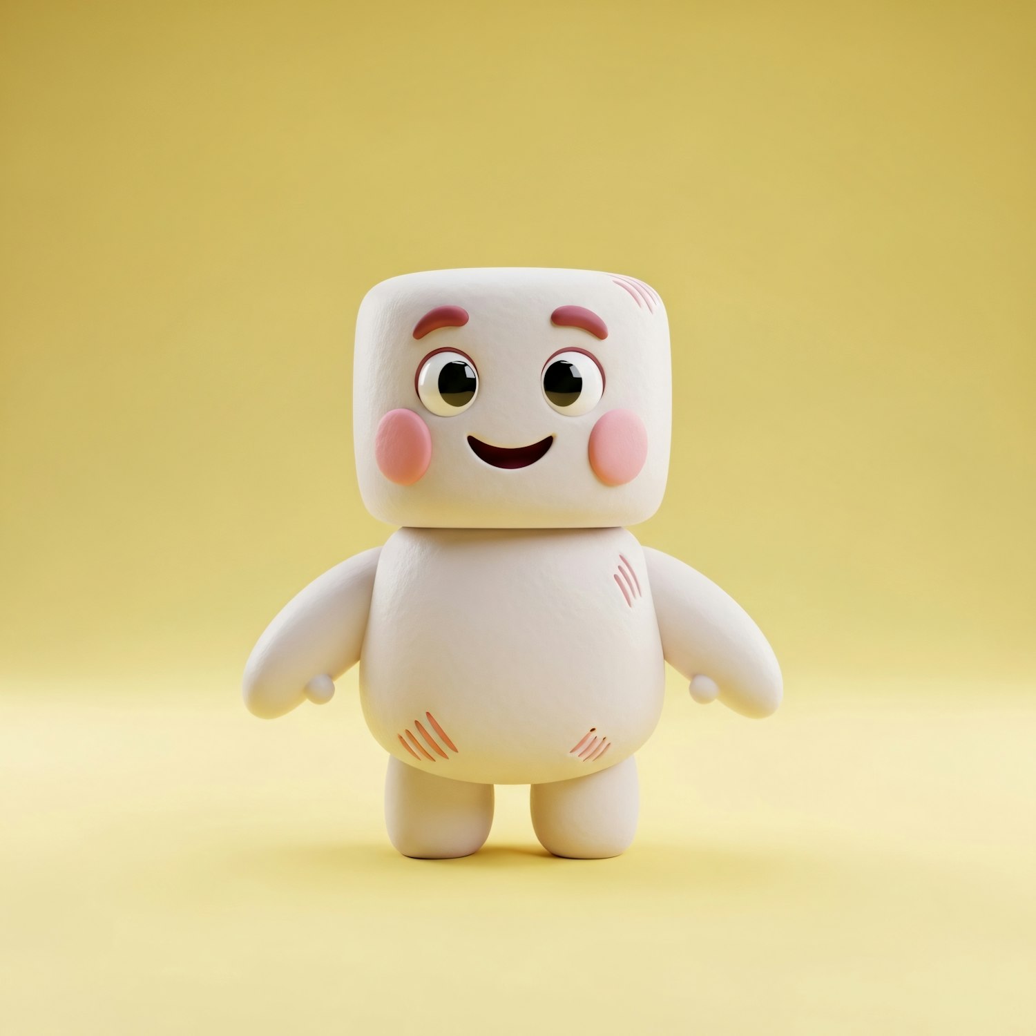 A cute 3D marshmallow character with a cheerful expression on a yellow background, perfect for playful and creative designs.