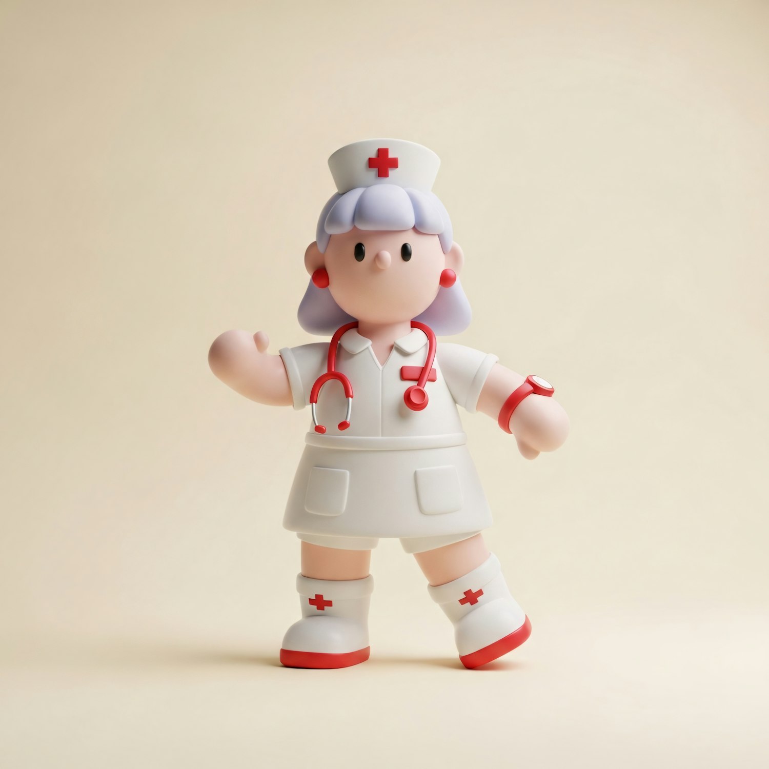 A charming 3D illustration of a nurse character in a white uniform with red accents, holding a stethoscope, set against a beige background.