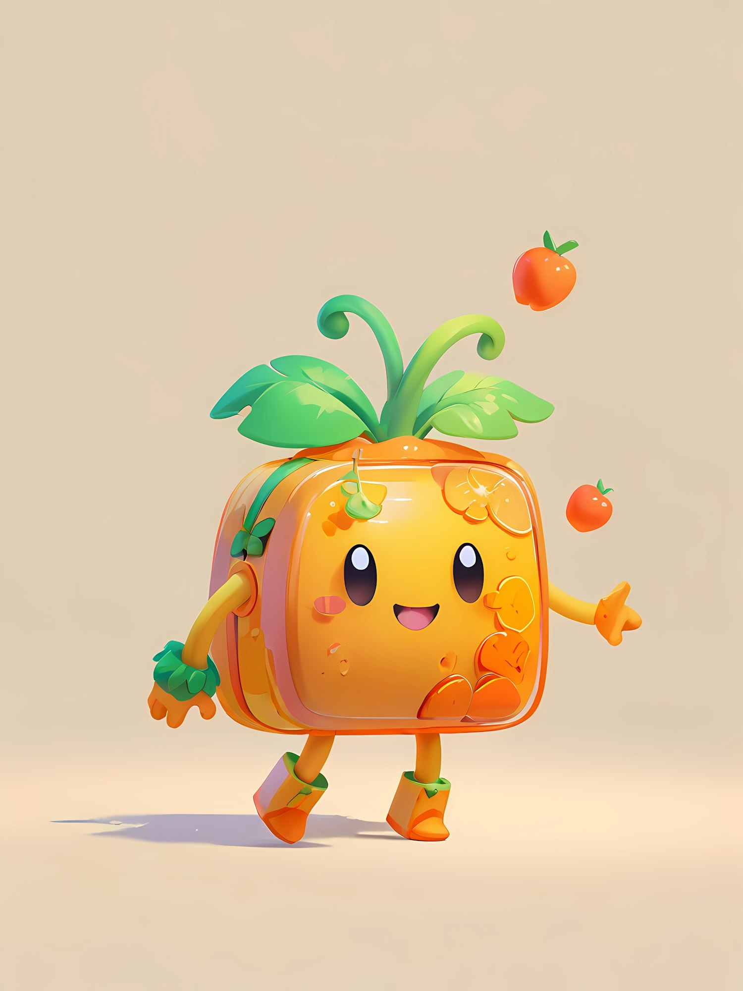 Adorable 3D orange character with leafy stems, a glossy texture, and floating fruits. Perfect for playful, vibrant designs!