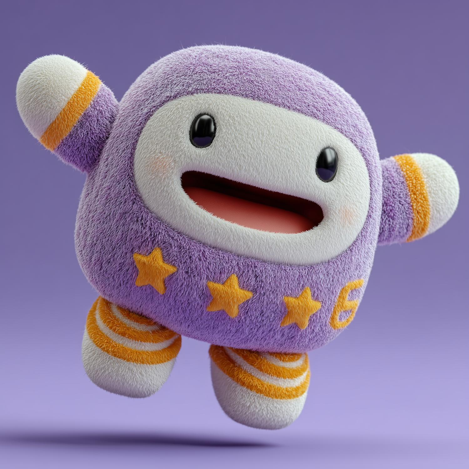 A cute 3D plush character with a purple body, orange accents, and a cheerful expression, set against a matching purple background.