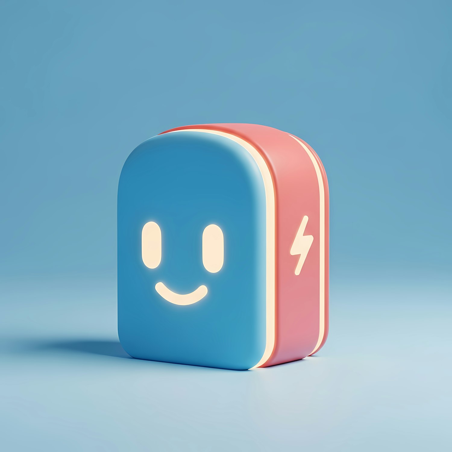 Cute 3D-rendered battery with a glowing smiley face and lightning bolt design, set against a clean blue background.