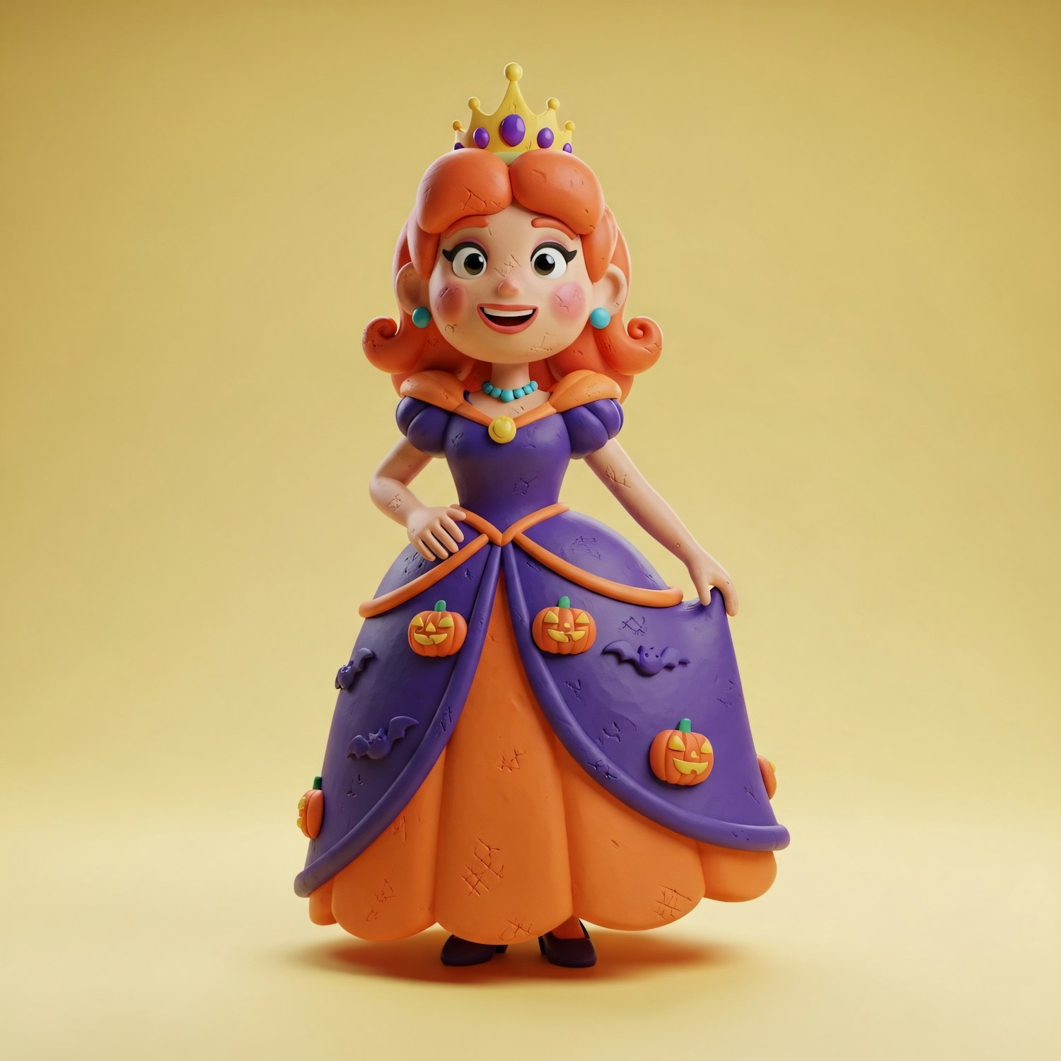 A vibrant clay figurine of a princess in a Halloween-themed dress with pumpkins and bats, set against a yellow background.
