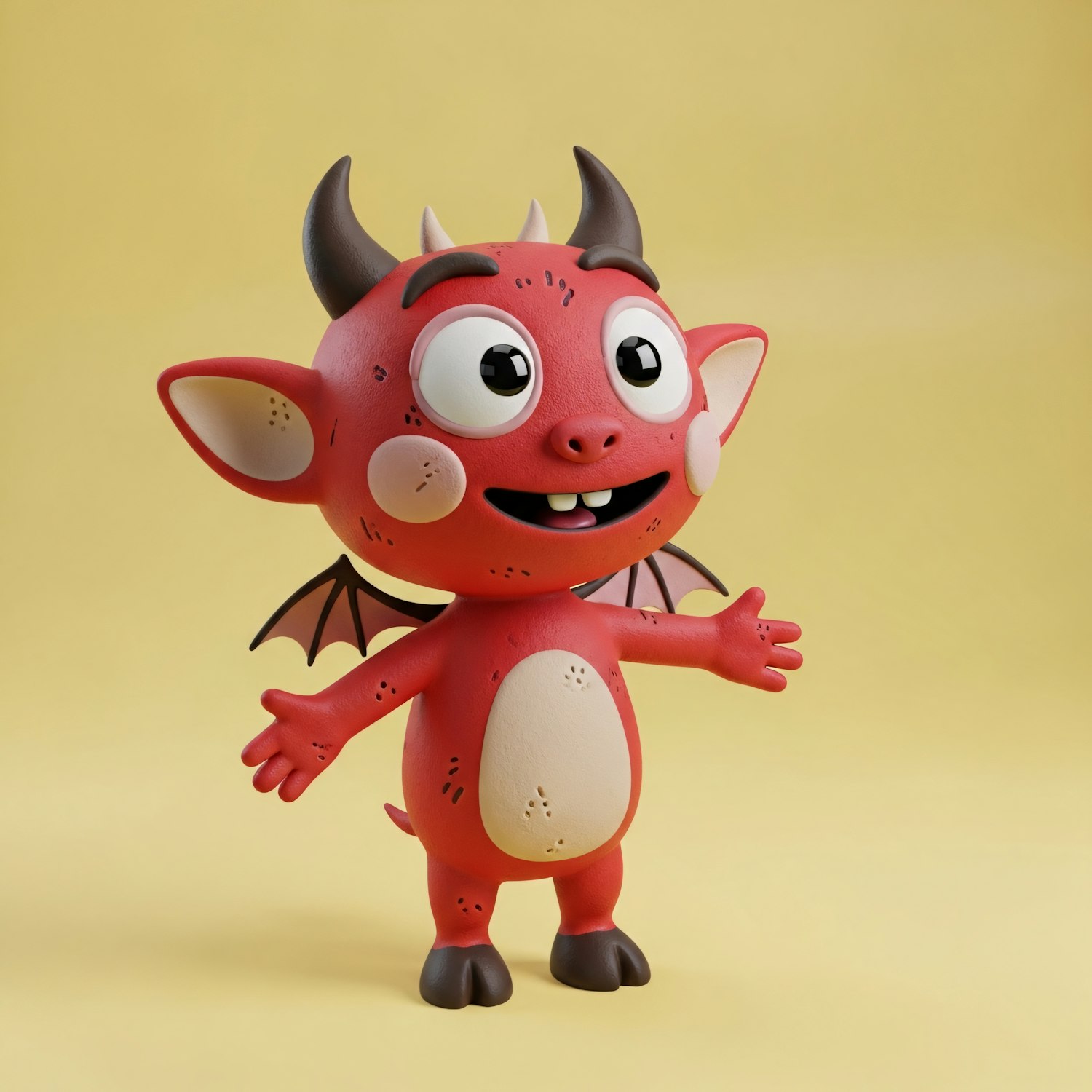 A cute 3D cartoon devil character with a cheerful expression, red skin, and small wings, set against a bright yellow background.