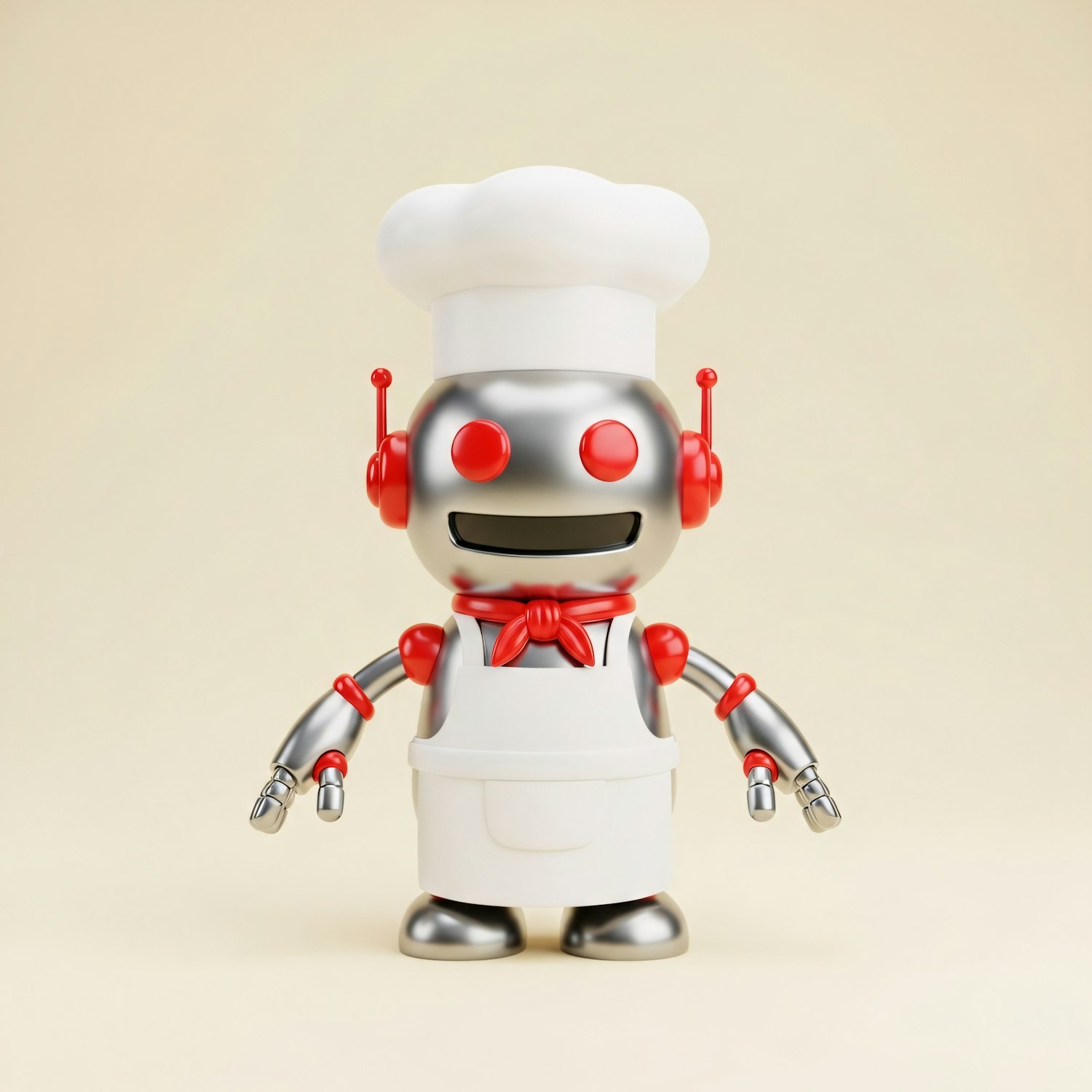 A cute robot chef with a metallic body, red accents, and a white chef's hat and apron, standing against a neutral background.