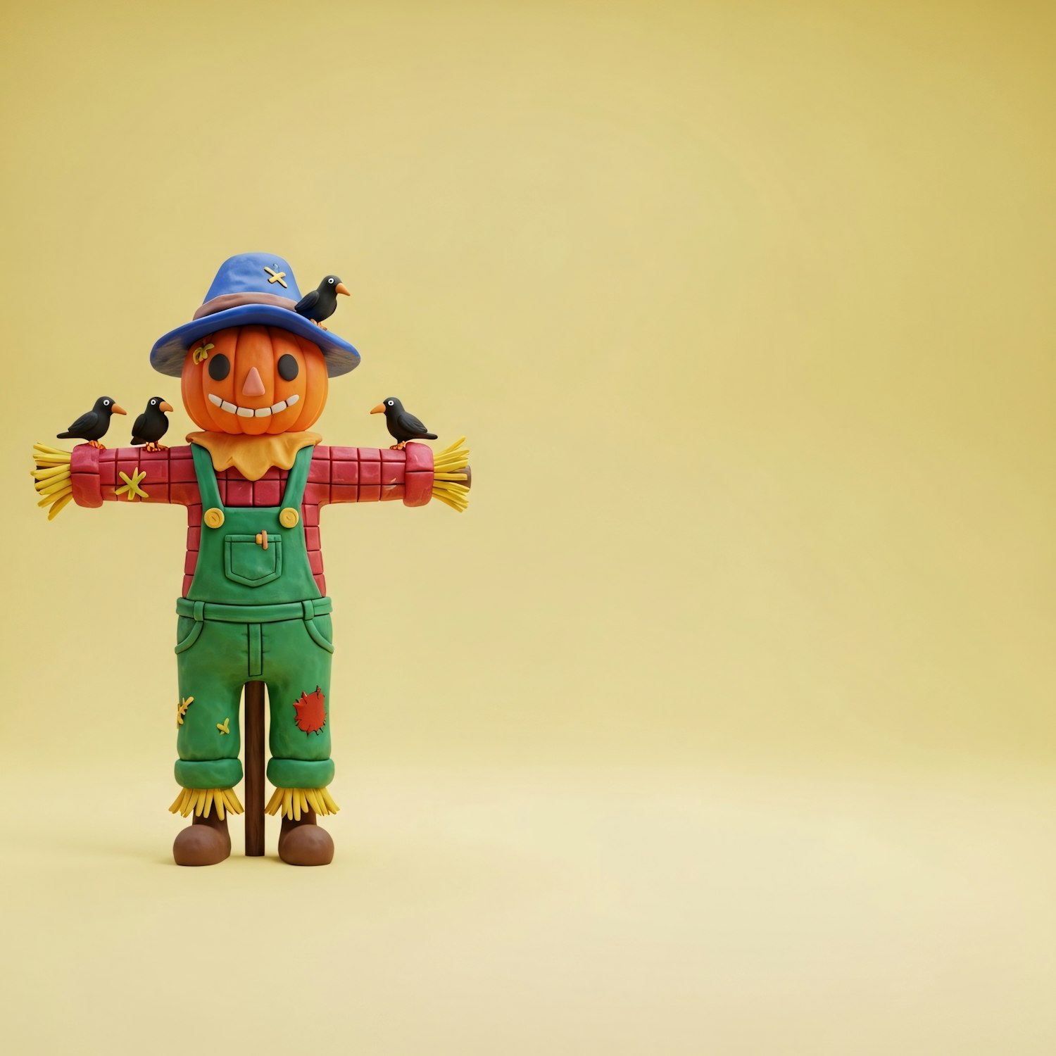 A colorful scarecrow with a pumpkin head and black birds perched on its arms, set against a bright yellow background.