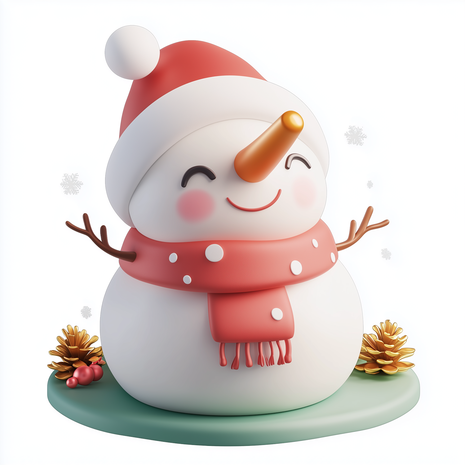 Adorable snowman with a red Santa hat and scarf, surrounded by pinecones and berries. Perfect festive winter decoration.