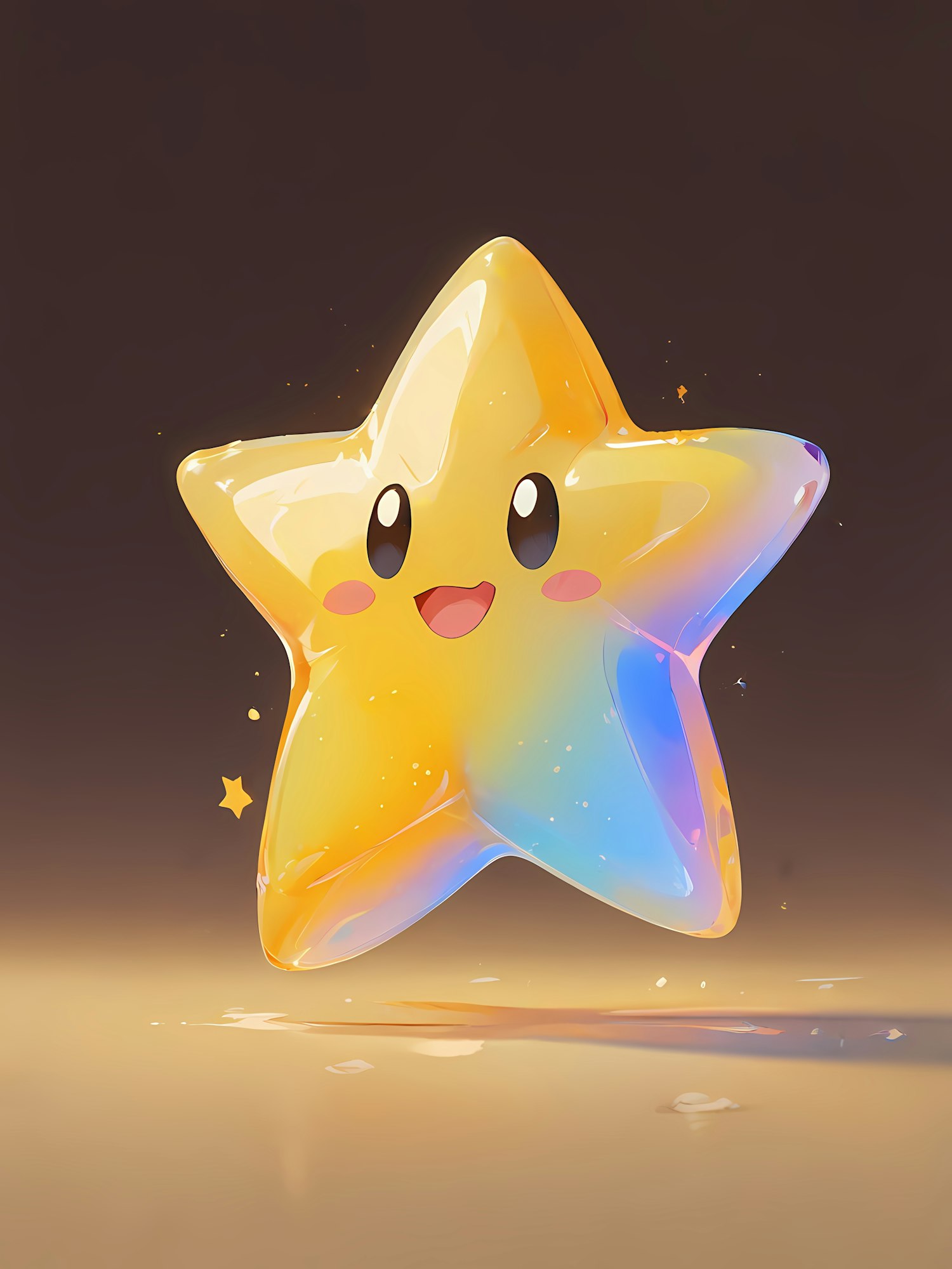 A cute, glossy star character with a golden glow, expressive eyes, and a magical iridescent finish on a dark gradient background.