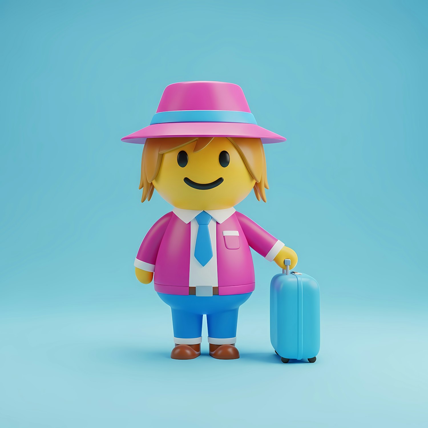 Cheerful 3D character in pink and blue attire with a suitcase, set against a light blue background. Perfect for travel or adventure themes.