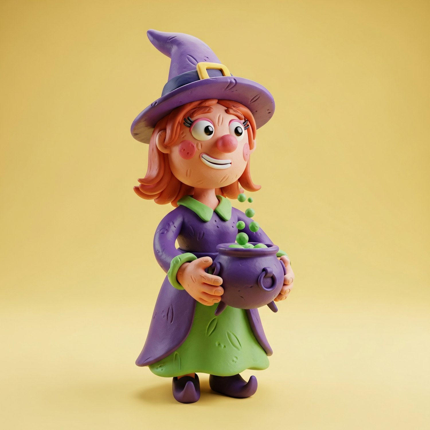 A colorful claymation-style witch holding a bubbling cauldron, set against a bright yellow background. Perfect for Halloween themes.