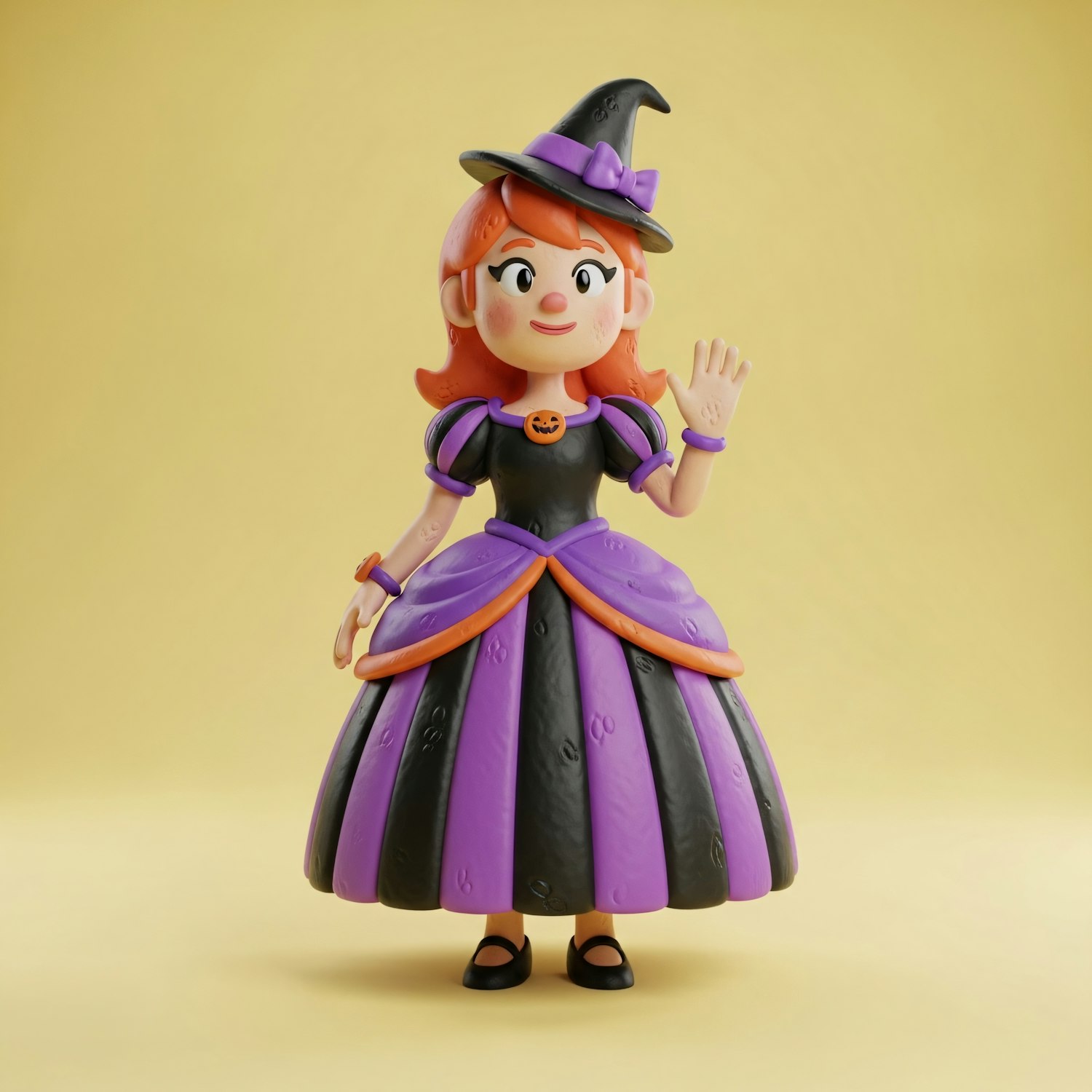 A cheerful cartoon witch figurine with orange hair, a black and purple dress, and a matching hat, waving against a yellow background.