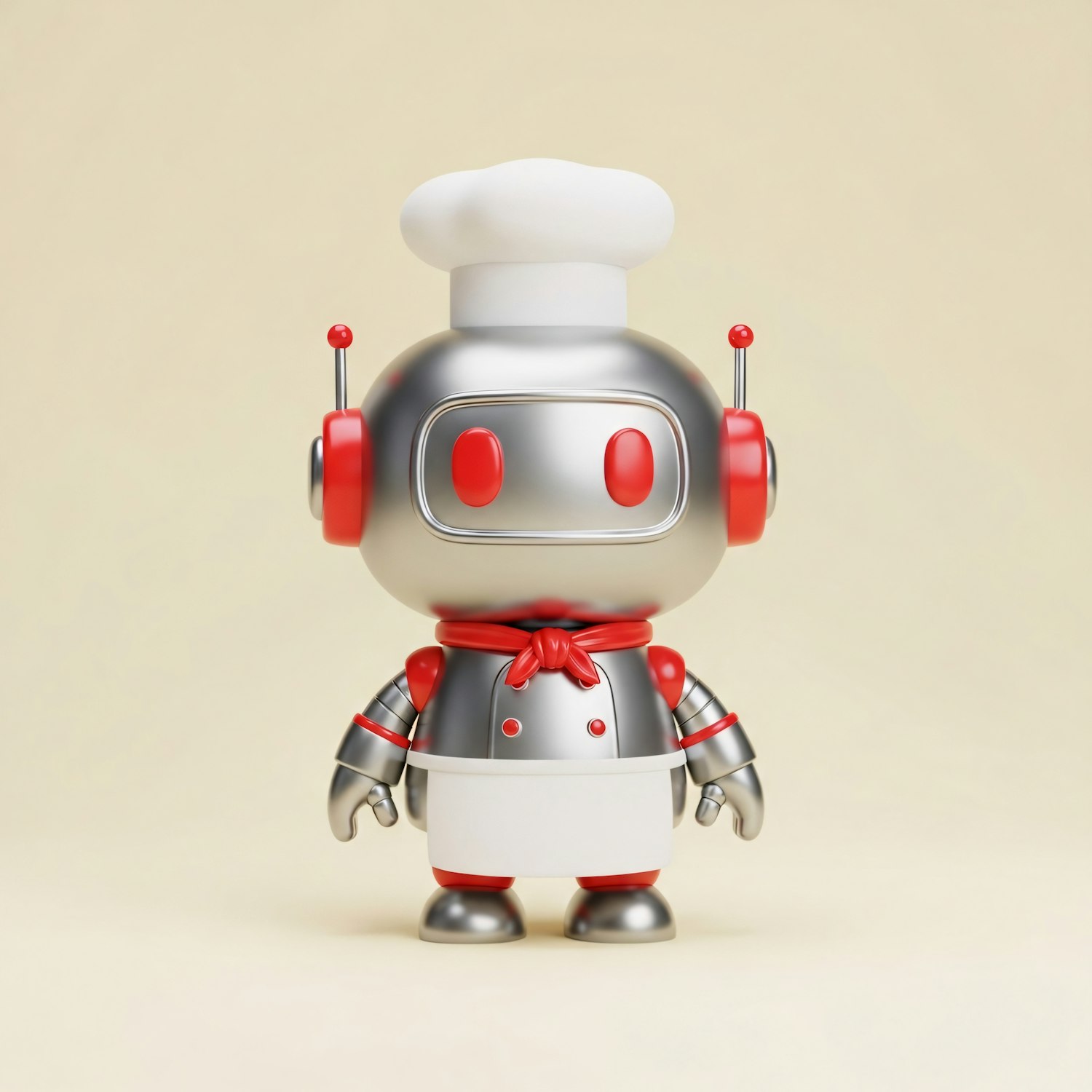 A cute robot chef with a silver body, red accents, and a chef's hat, standing against a beige background. Perfect for creative projects.