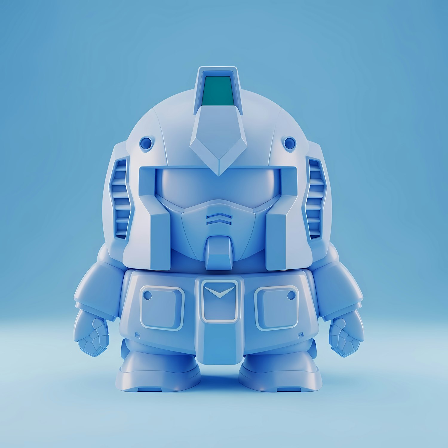 Adorable chibi-style blue robot with a rounded design and angular details, set against a light blue background. Perfect for sci-fi fans!