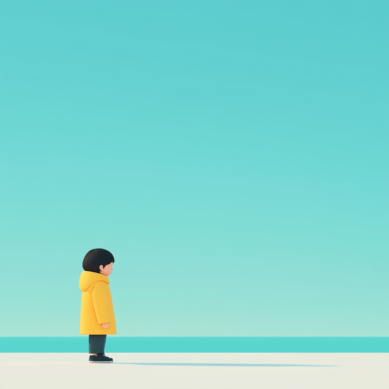 Minimalist illustration of a child in a yellow coat on a beach with a clear blue sky and turquoise water.