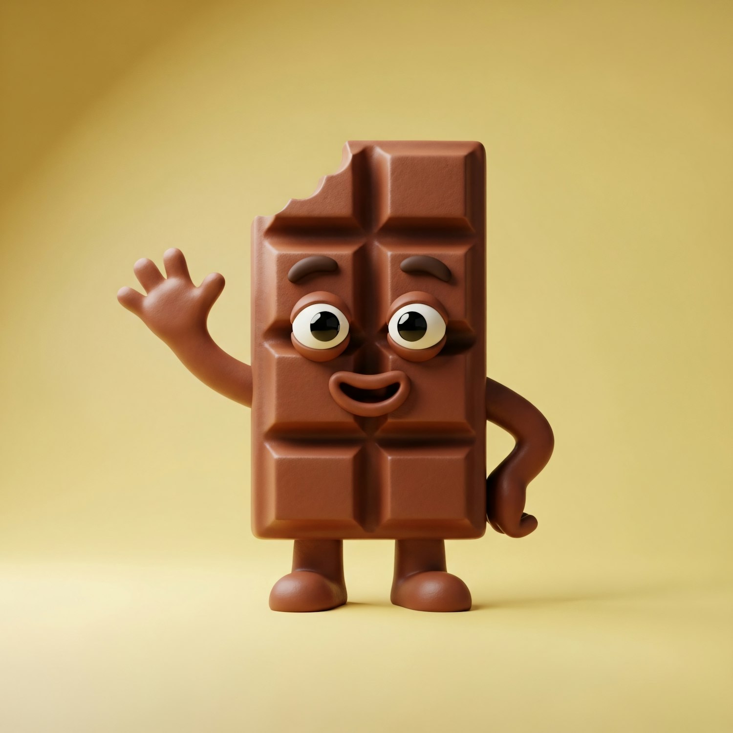A cheerful 3D chocolate bar character with a bite taken out, waving against a warm yellow background. Fun and inviting design.