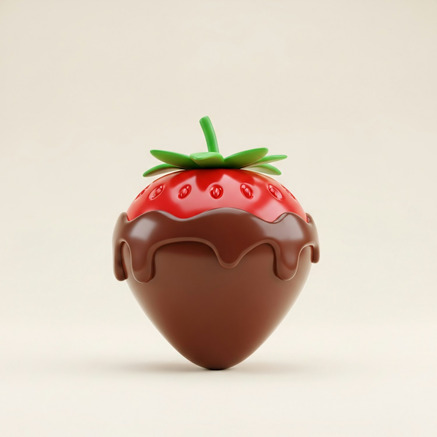 A vibrant 3D-rendered strawberry dipped in chocolate, showcasing a glossy finish and realistic details on a neutral background.