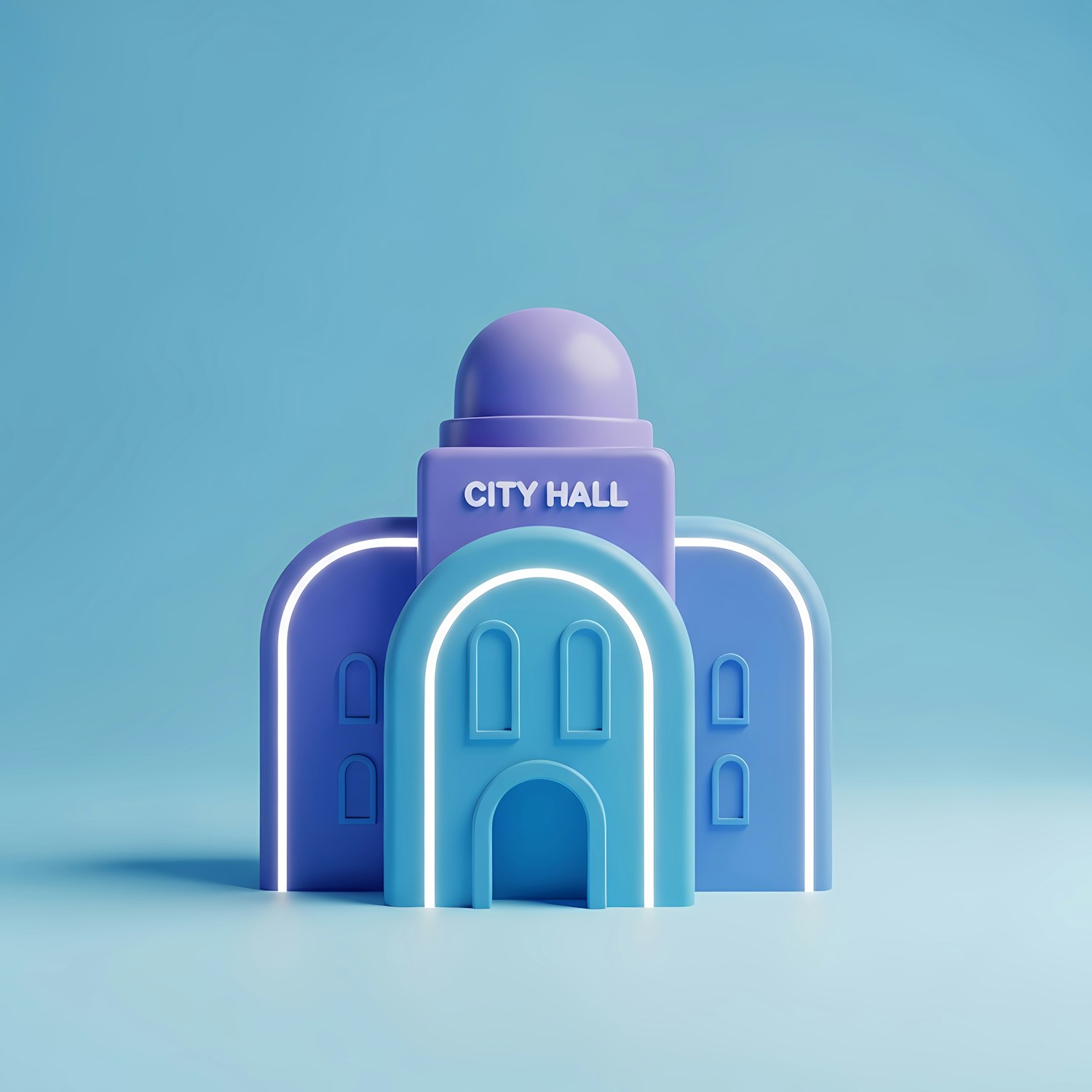 A vibrant 3D illustration of a city hall building in blue and purple tones, featuring a dome and arched windows, set against a light blue background.
