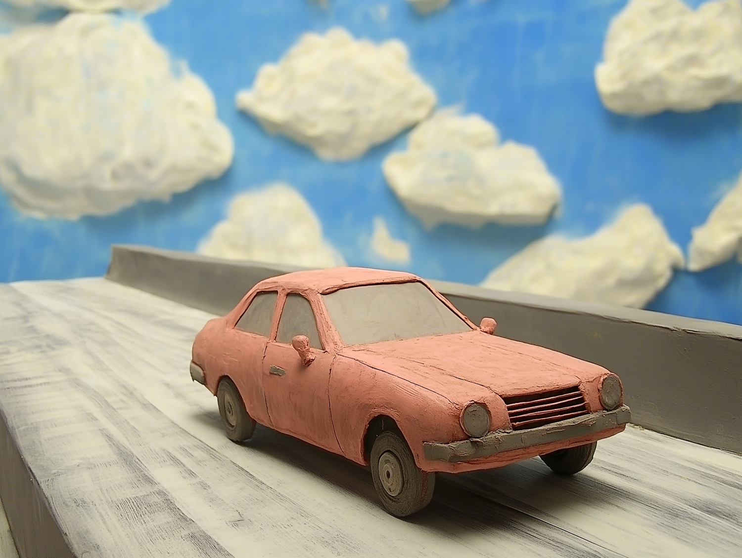 Clay model car on a painted road with a blue sky and fluffy clouds, creating a whimsical and artistic scene.