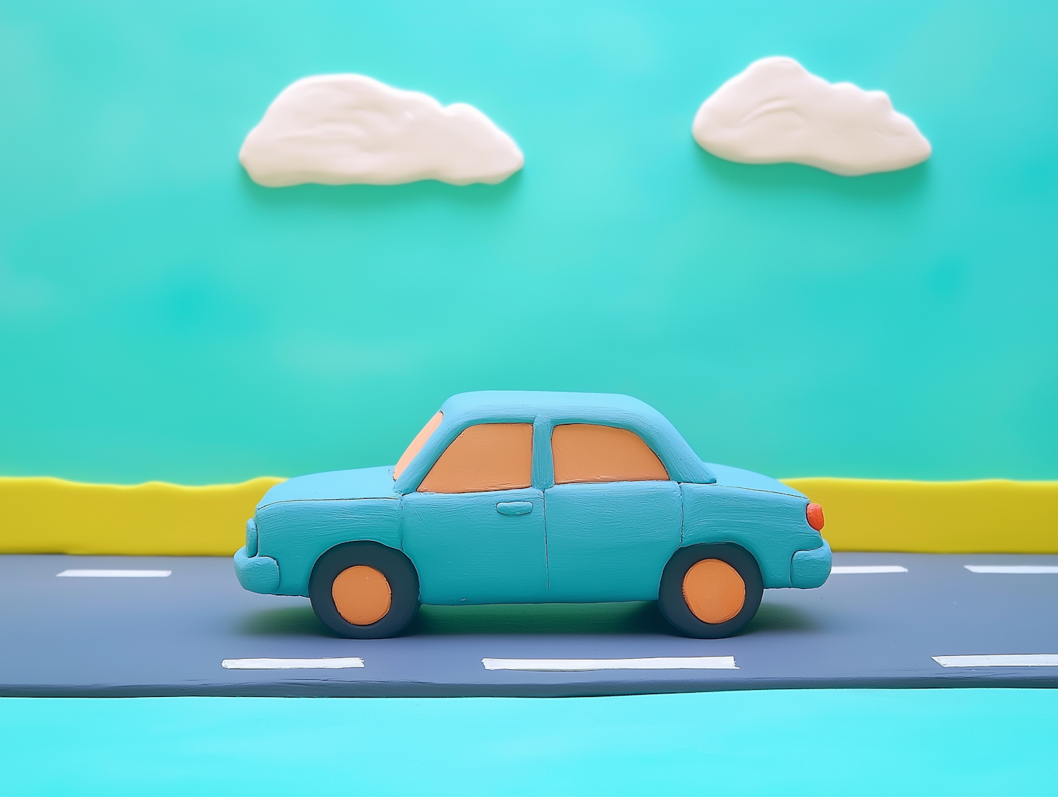 Claymation-style blue car with orange windows on a road, set against a turquoise sky with fluffy clouds. Playful and colorful scene.