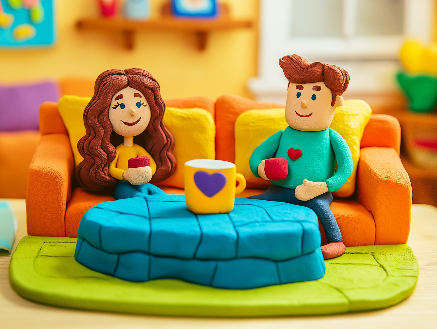 Claymation scene of two characters on a couch with colorful decor, holding cups and smiling, creating a cozy and cheerful atmosphere.